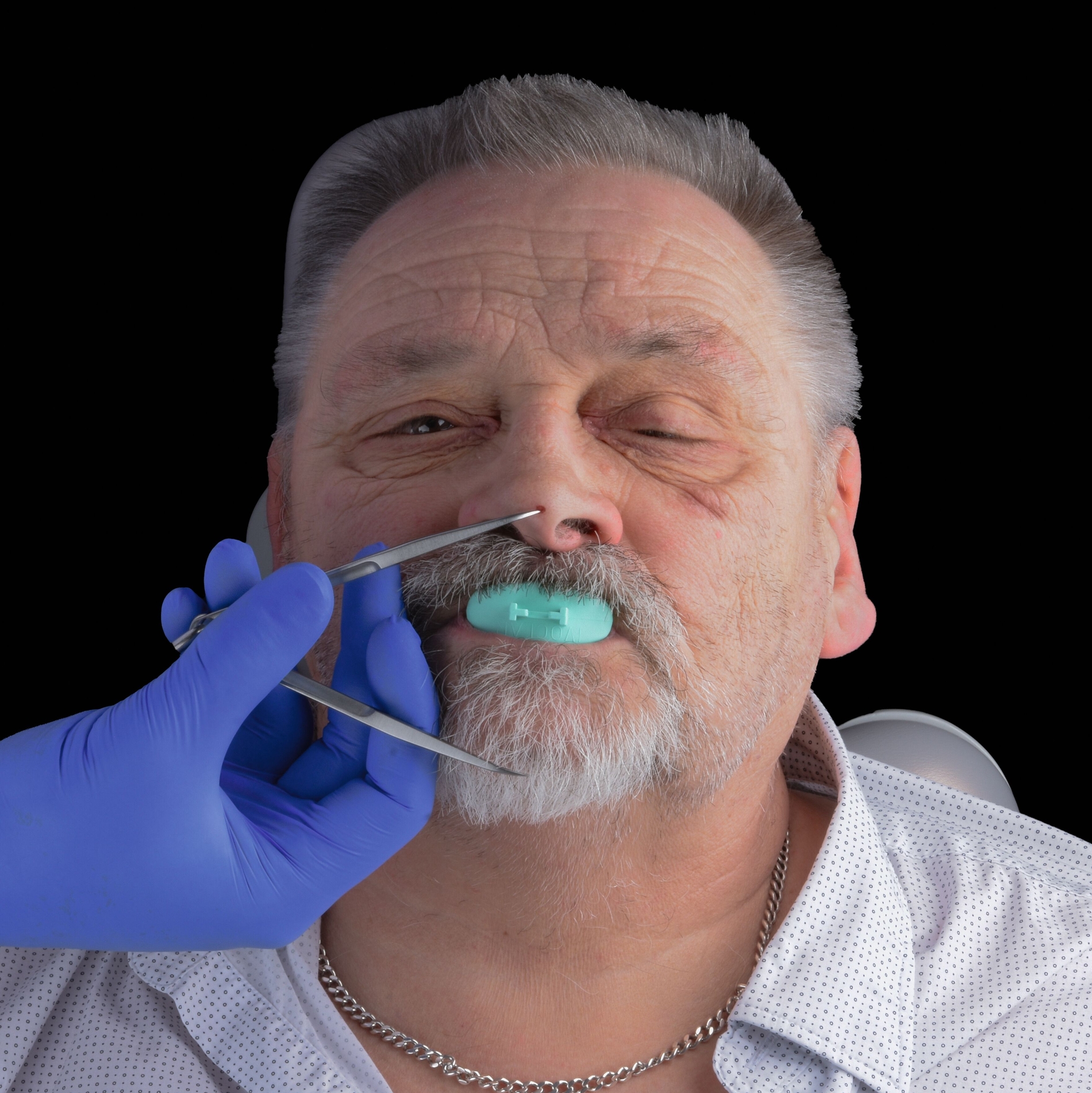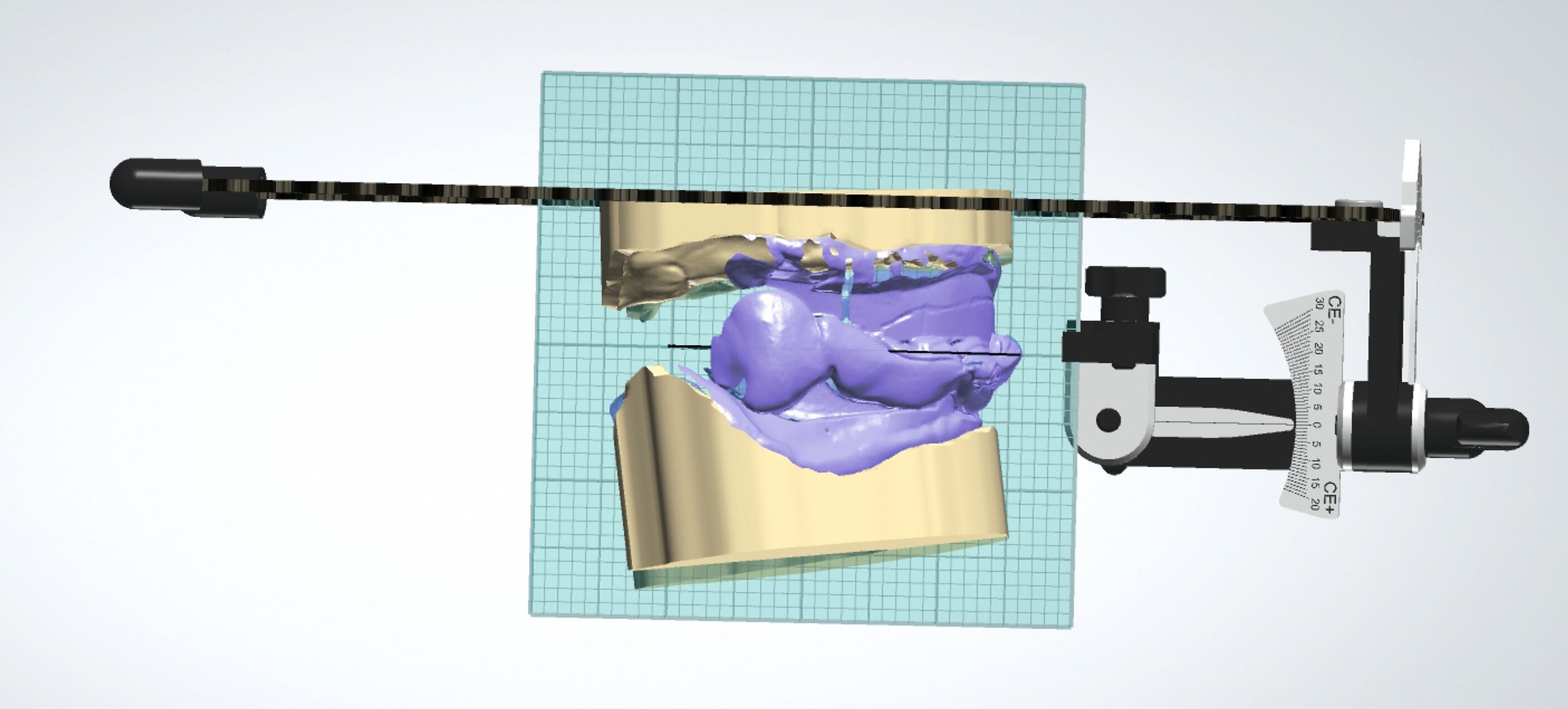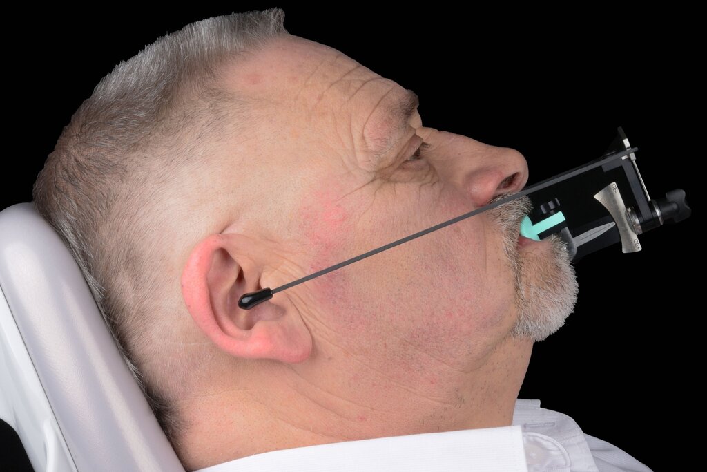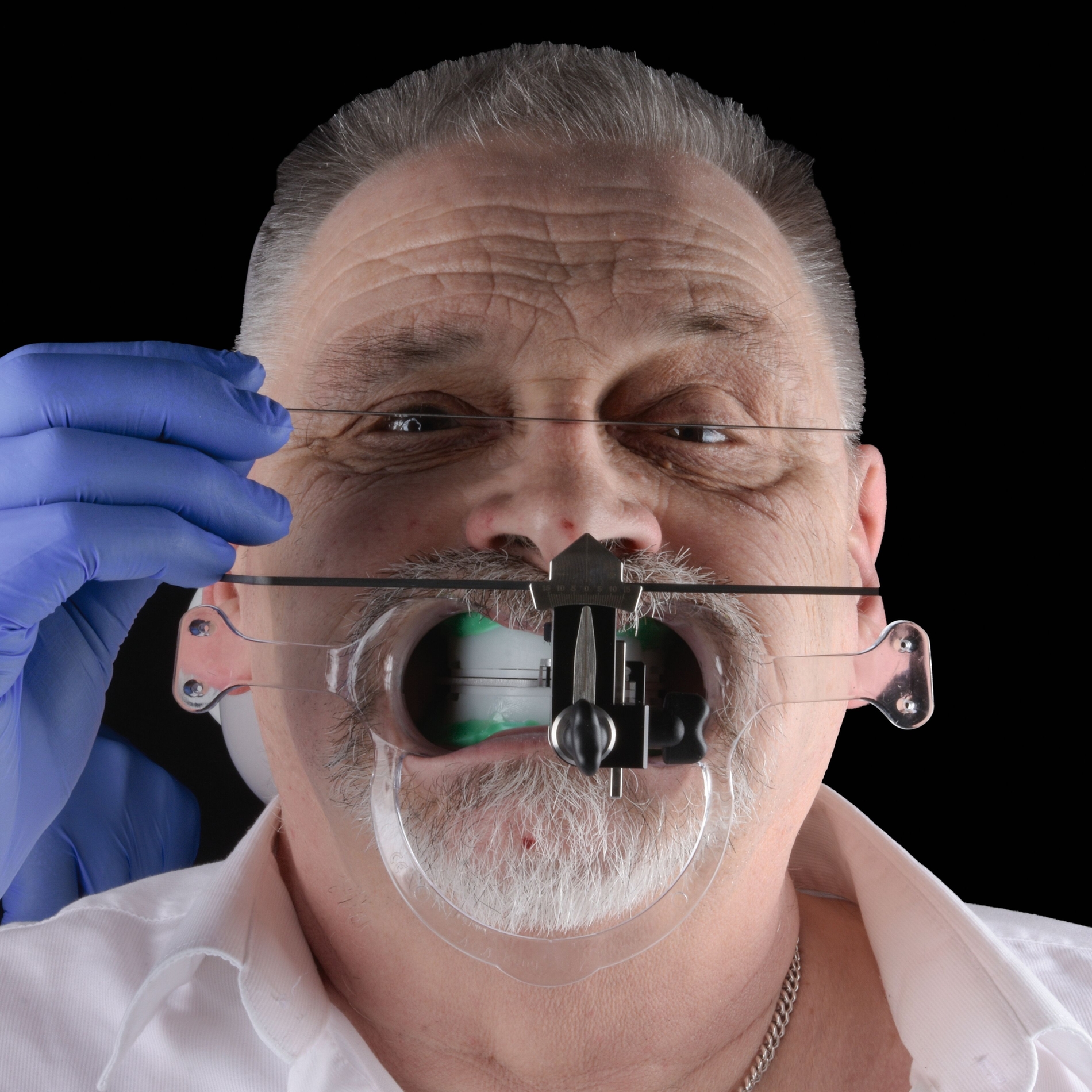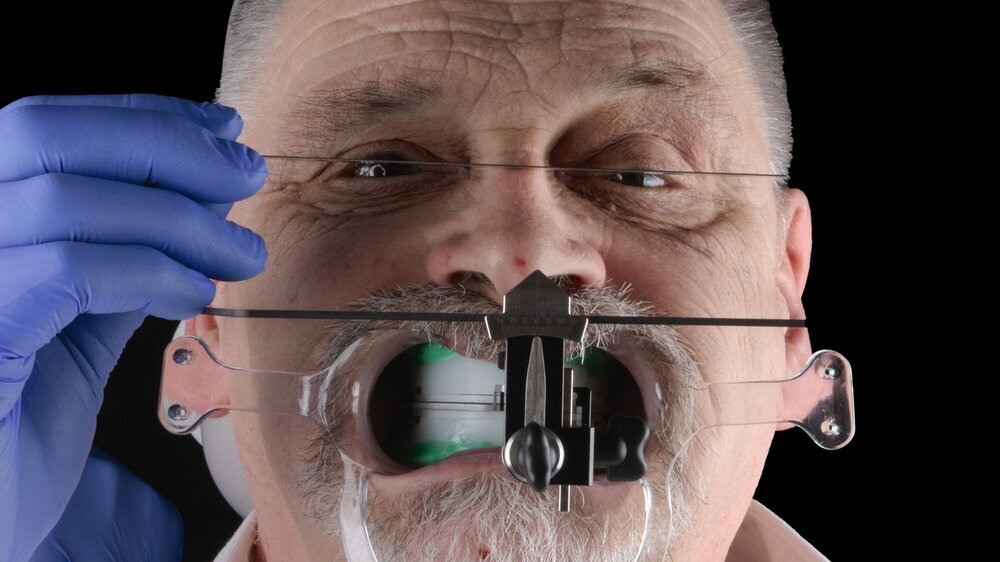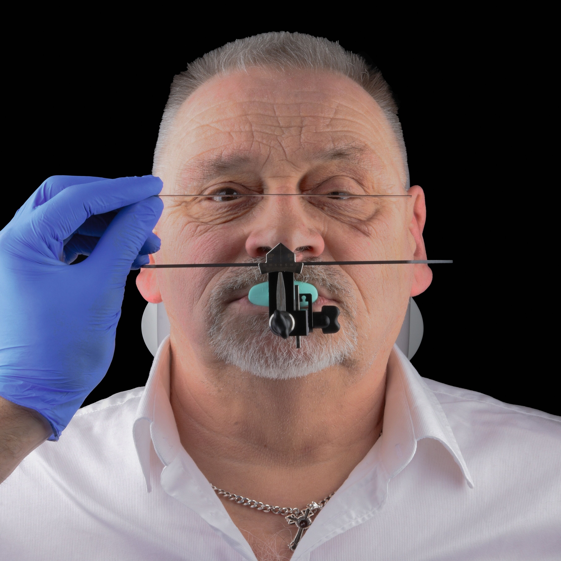 Zur vorläufigen Bestimmung der patientenindividuellen Lage der Okklusionsebene wurde als abschließender Schritt der ersten Behandlungssitzung der Gesichtsbogen des Ivotion-Systems, der sogenannte UTS-CAD (Ivoclar Vivadent), am Adapter des Centric Trays befestigt und klassisch nach Camper-Ebene sowie Bipupillarlinie ausgerichtet (Abbildung 5). Die ermittelten Werte mussten lediglich am UTS-CAD abgelesen, notiert und dem Labor für das im Folgenden anstehende Design der kombinierten Funktionslöffel und Bissschablonen, den sogenannten 3D-Bite-Plates, bereitgestellt werden. Ein Versenden des Gesichtsbogens war nicht notwendig.