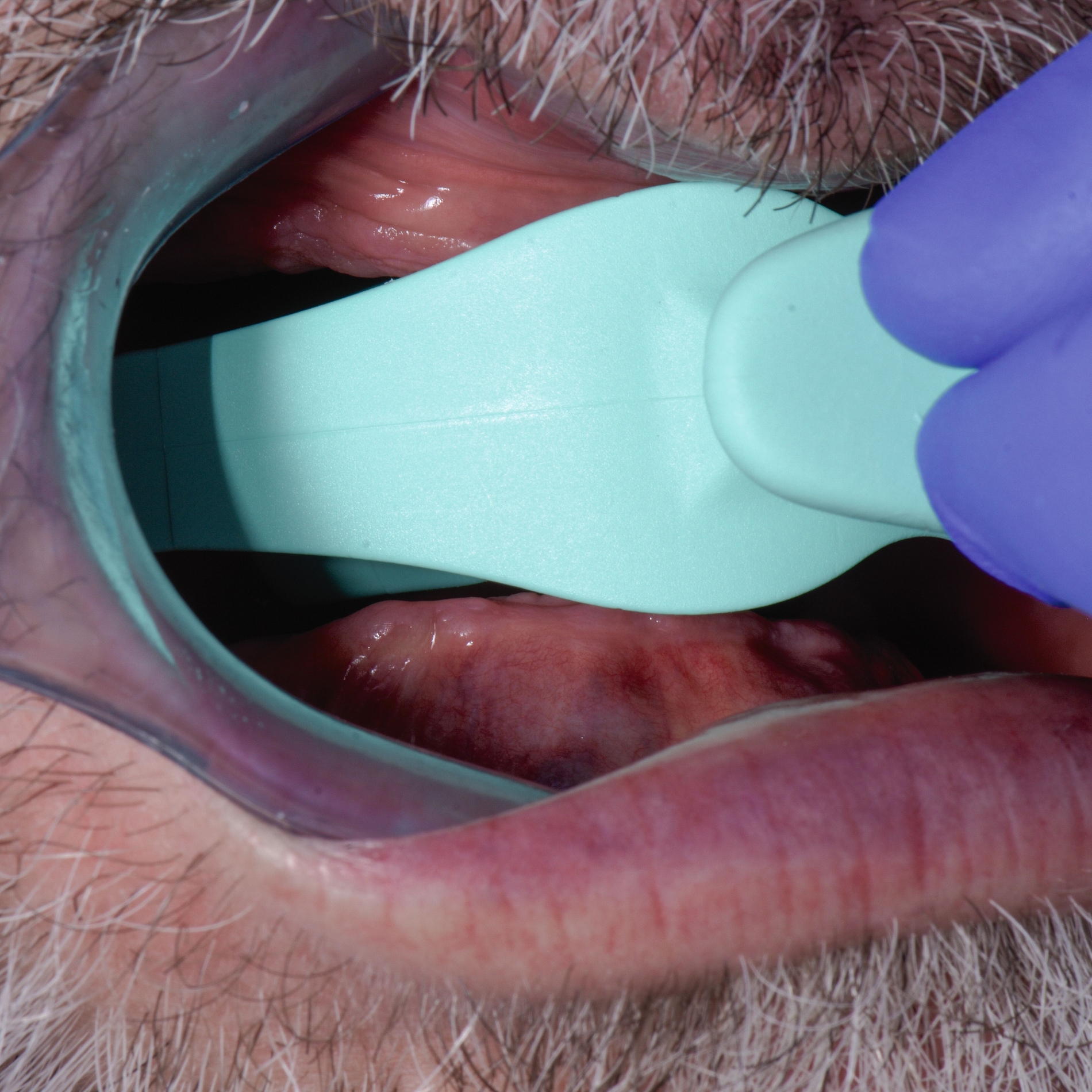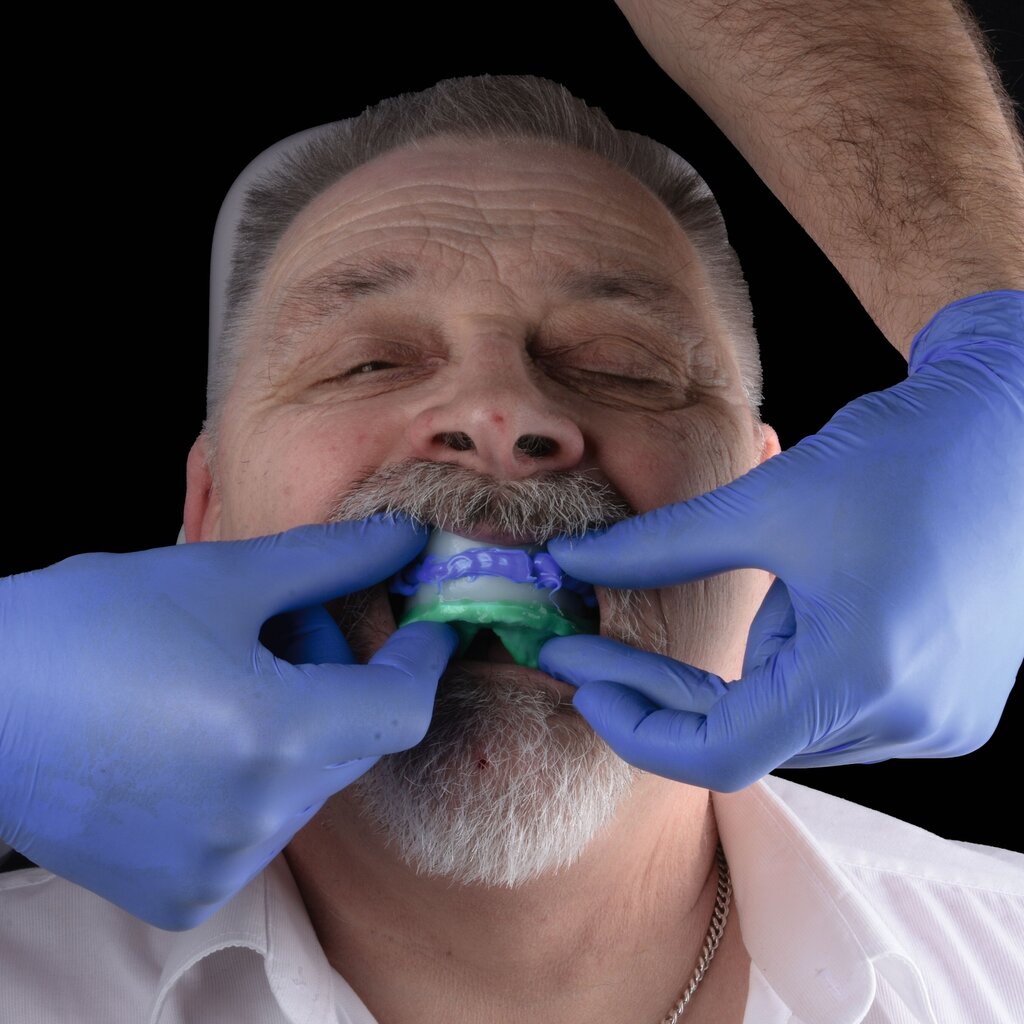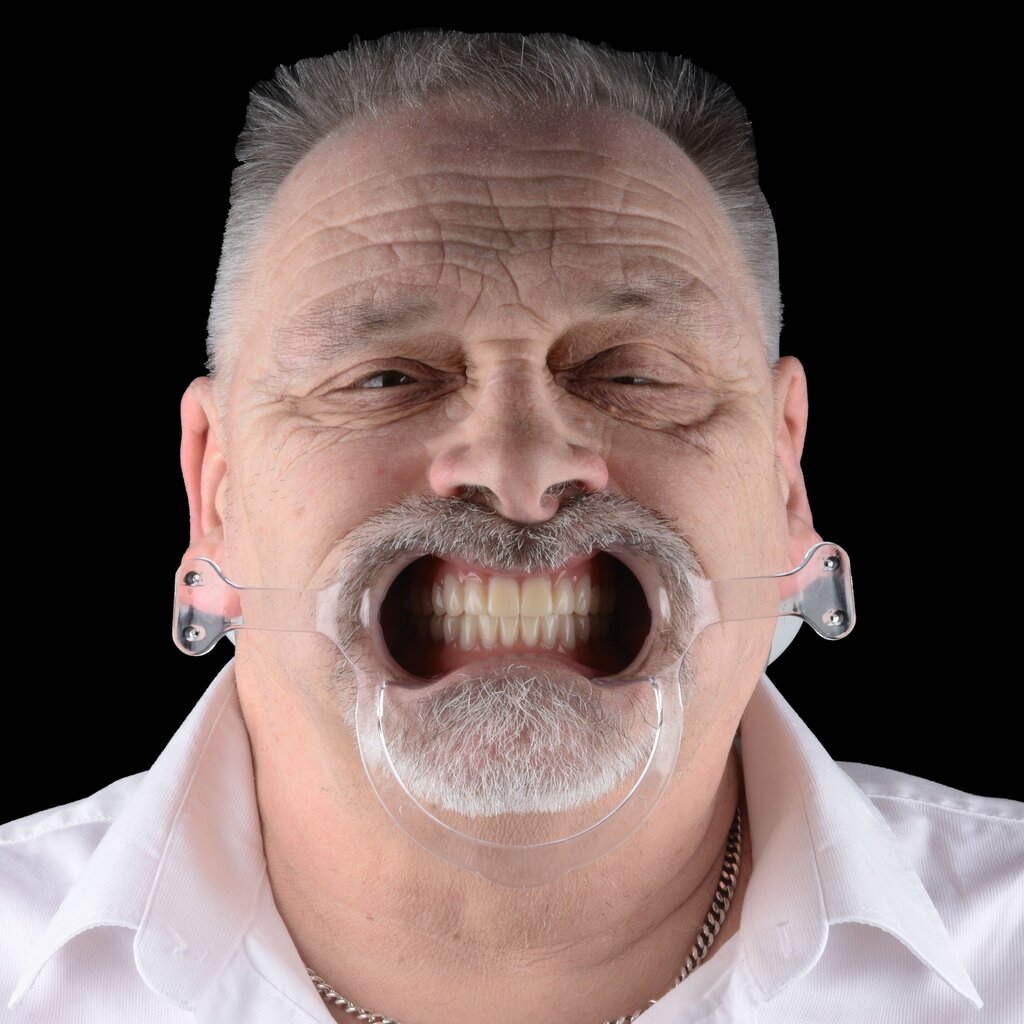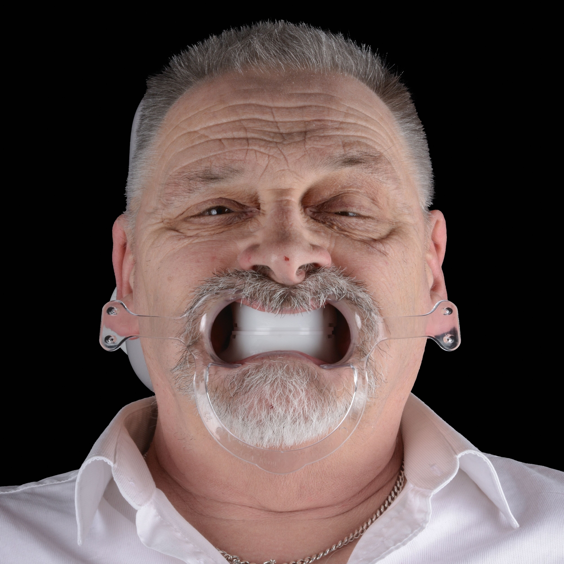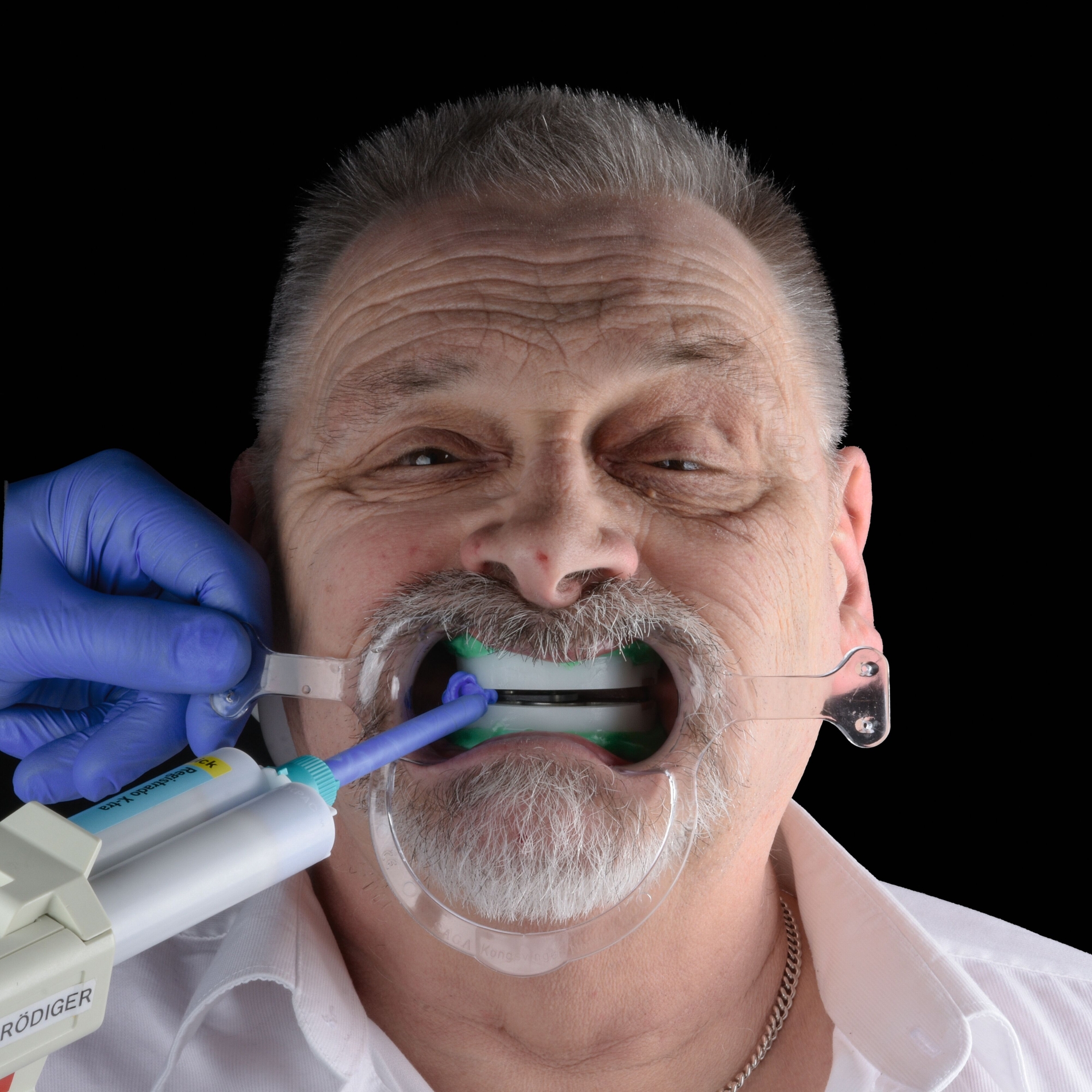 Für die Funktionsabformung wurde zunächst der Funktionsrand des Oberkiefers analog zur Situationsabformung mit einem C-Silikon (sta-seal f, Fa. DETAX GmbH) myodynamisch ausgeformt, um diesen muskelgriffig zu gestalten. Zur Gewährleistung einer gleichmäßigen Schichtstärke der Abformung wurden zuvor drei Stops aus selbigem Material auf der Unterseite der 3D-Bite-Plates angebracht. Anschließend folgten die Abformung der Kieferbasis mit einem fließfähigen C-Silikon (Xantopren comfort medium, Fa. Kulzer) unter erneuten (aktiven und passiven) Funktionsbewegungen (Abbildung 8) und die Markierung der dorsalen Abdämmung mit einem thermoplastischen Material (EX-3-N Gold, Fa. Johannes Meist). Nach Positionierung der Oberkieferabformung wurde der noch unbefüllte Unterkieferlöffel ebenfalls eingesetzt und der Patient angewiesen, den Mund zu schließen. Dabei mussten die Aufbissplatten erneut plan und parallel schließen. Die Abformung des Unterkiefers erfolgte analog zu der des Oberkiefers. Erneut wurde der bündige Abschluss der Aufbissplatten sichergestellt. Beide Abformungen wiesen nun einen Saugeffekt auf und konnten lagestabil repositioniert werden.