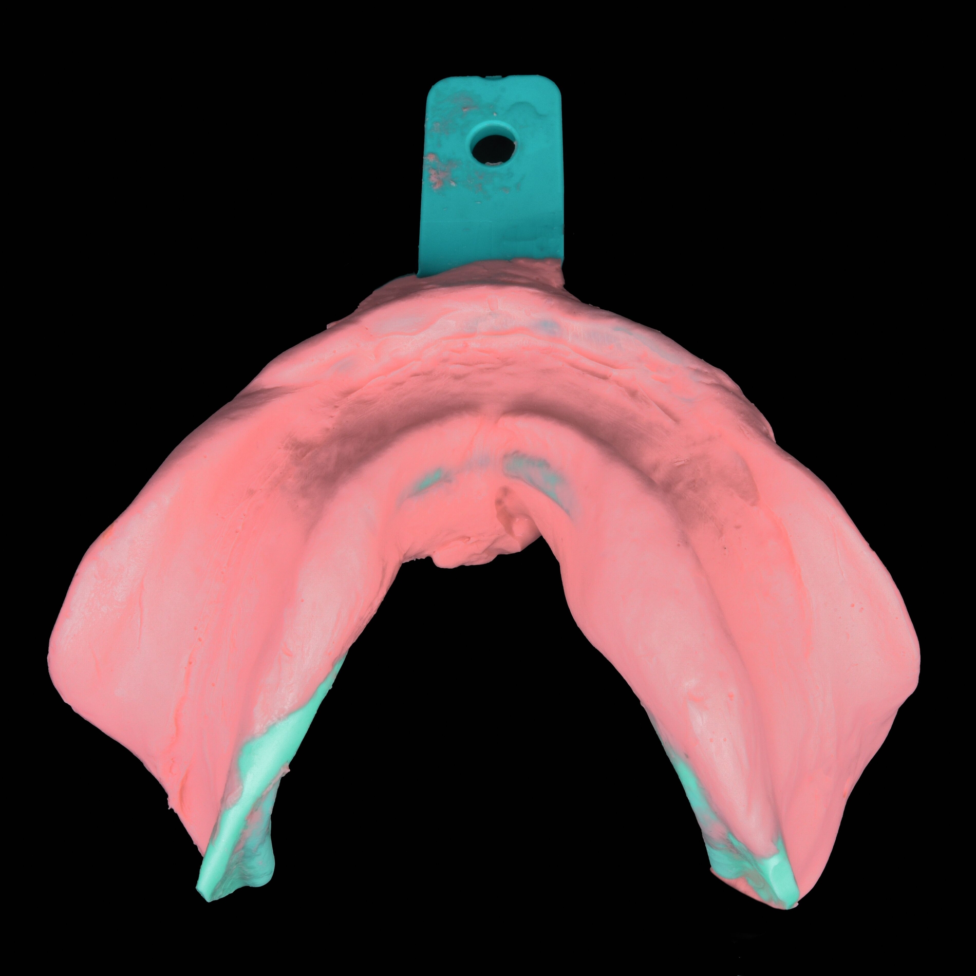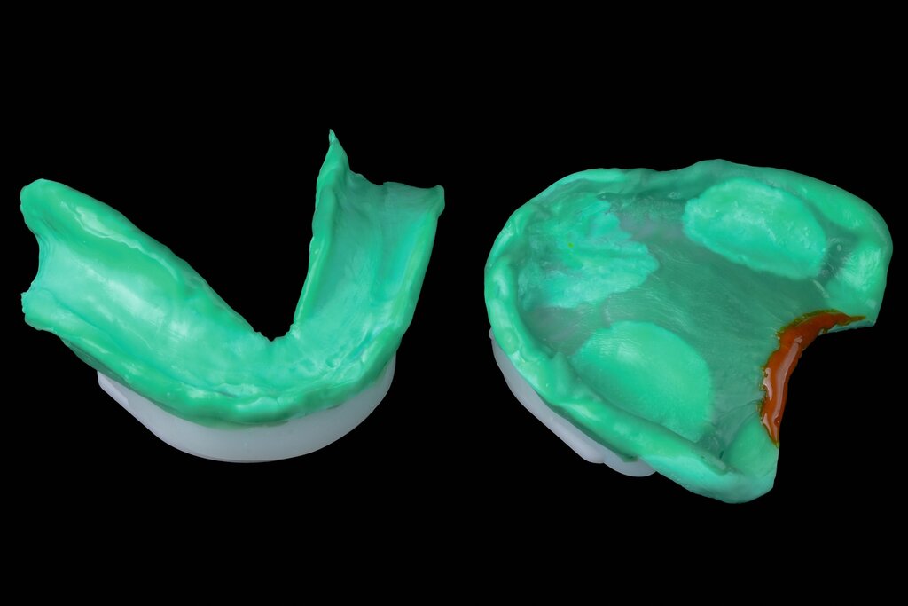 Entsprechend dem konventionellen Workflow erfolgte in der ersten Sitzung die anatomische Abformung der zahnlosen Kiefer mit Löffeln nach Schreinemakers (Abbildung 1). Zur präzisen Darstellung des Vestibulums wurde der konfektionierte Abformlöffel initial mit einem C-Silikon individualisiert (sta-seal f, DETAX GmbH, Ettlingen, D), gefolgt von der Situationsabformung mit Alginat (Maxima, Henry Schein, Berlin, D).