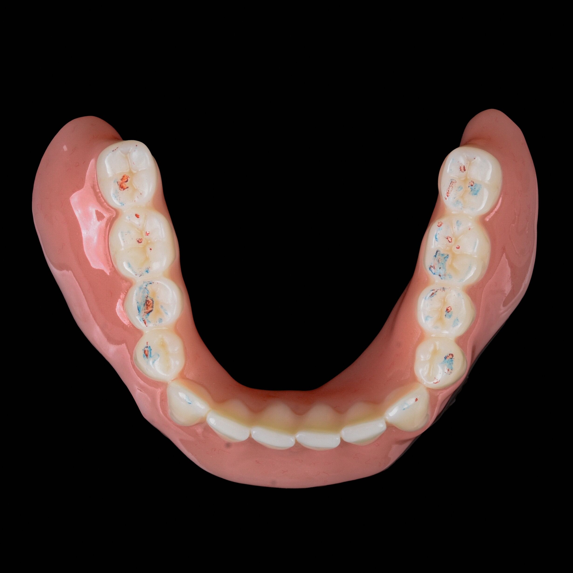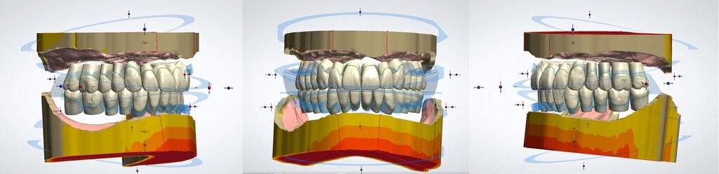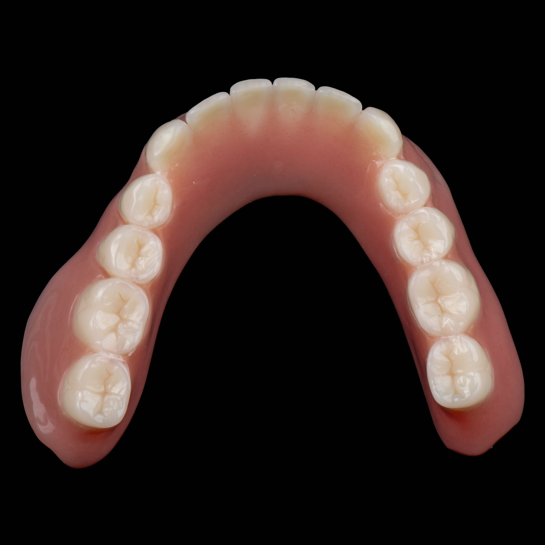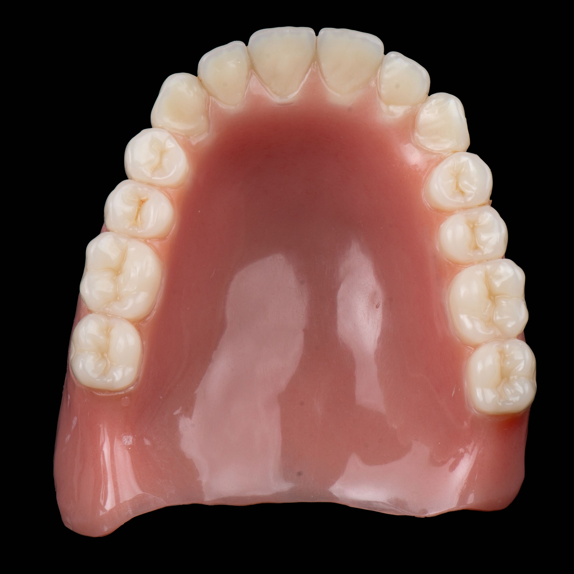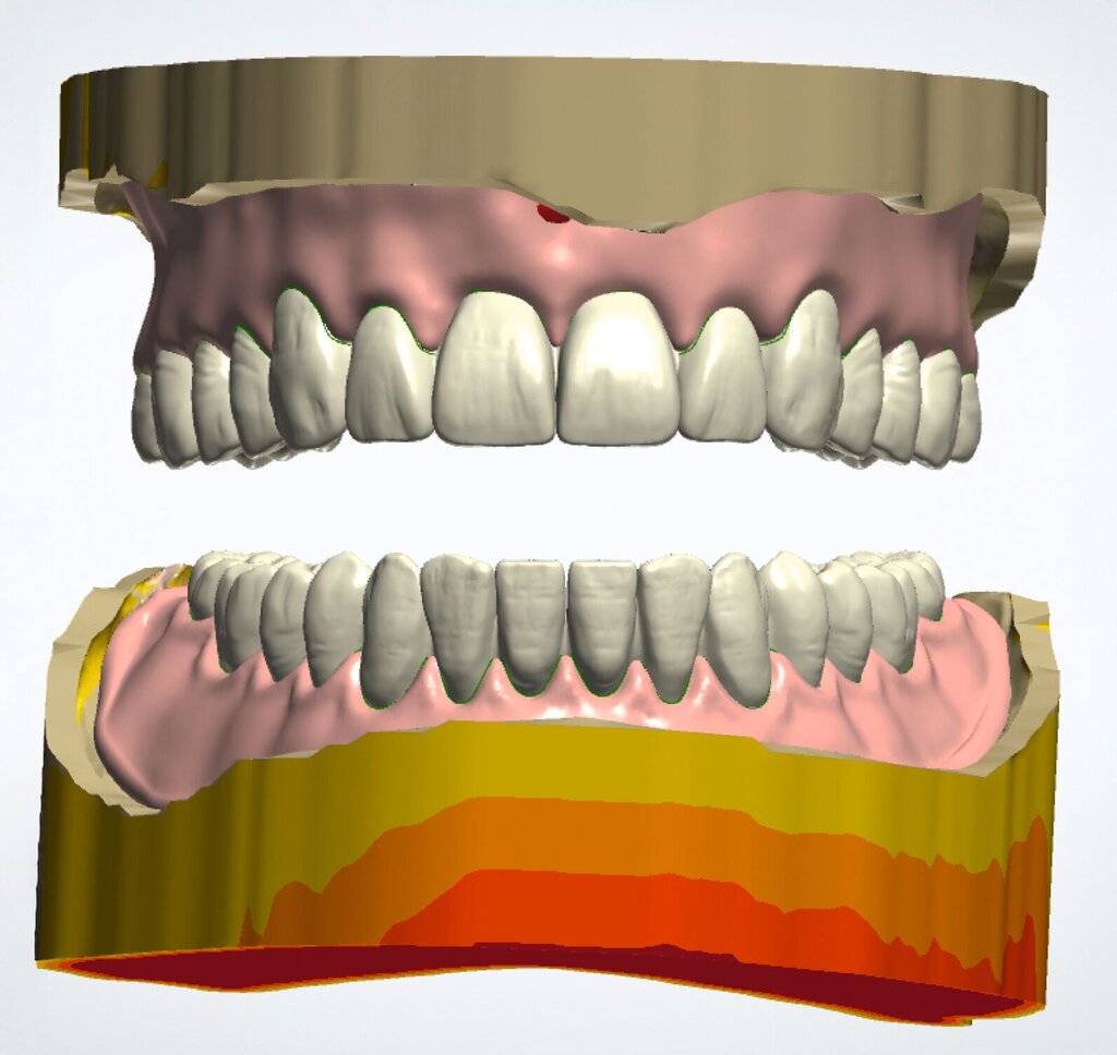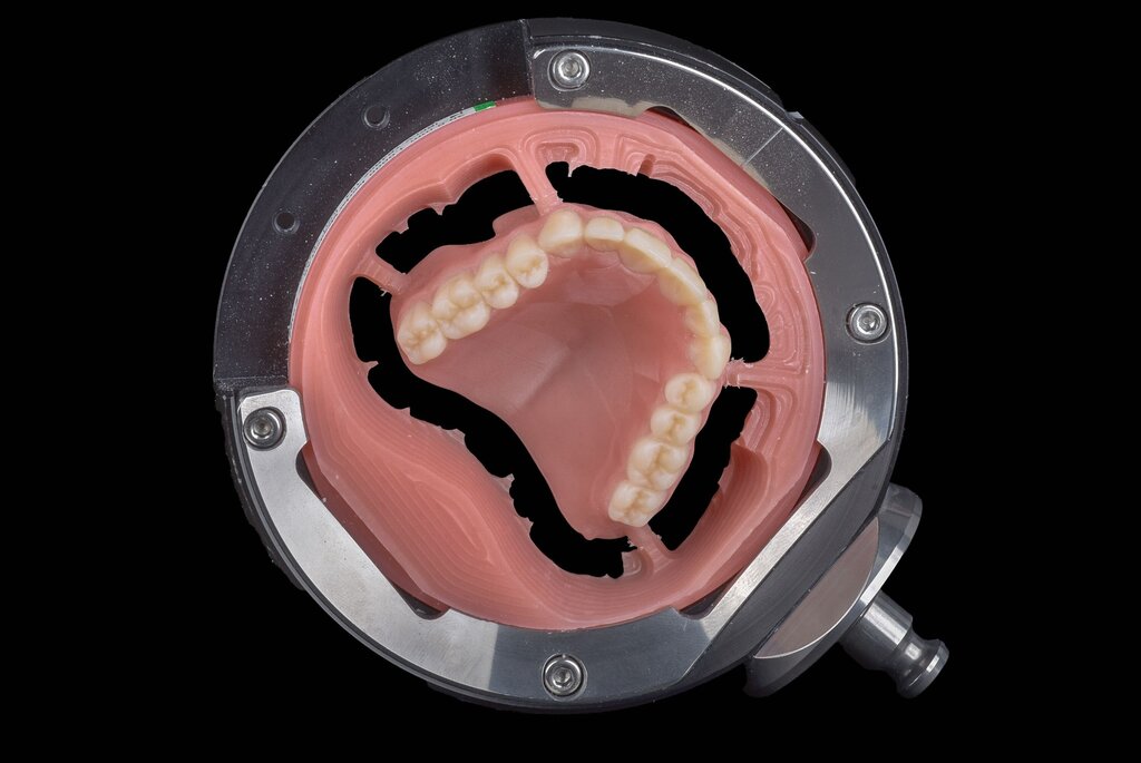 Sollte die Herstellung aus einem monolithischen Rohling aus morphologischen Gründen oder dem Wunsch der Patientin oder des Patienten nach einem Farbverlauf in den Zähnen nicht möglich sein, wäre die getrennte Herstellung von Prothesenbasis und -zähnen ebenfalls denkbar.