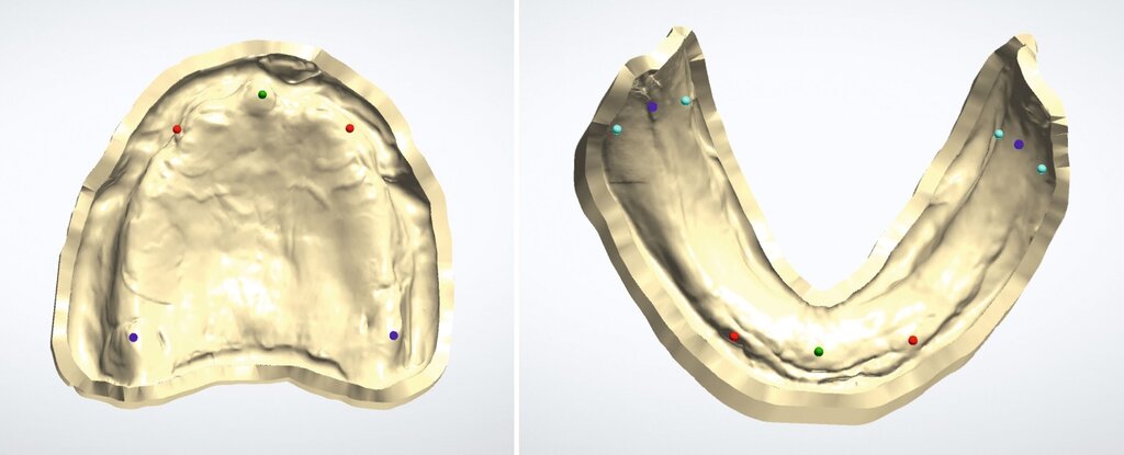Wie im konventionellen Workflow erfolgte nun die Auswahl der passenden Zahngarnitur beziehungsweise Garniturgröße anhand der Markierungen auf den 3D-Bite-Plates. Ein Vorteil des digitalen Workflows zeigt sich in der Verfügbarkeit vielfältiger Garnituren und Designs, die ein großes Repertoire an Zahnformen zur patientenindividuellen Gestaltung bieten.