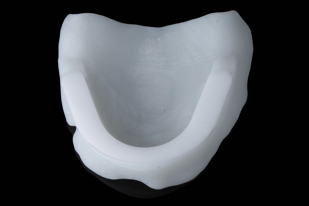 Die im Labor subtraktiv hergestellten 3D-Bite-Plates wurden aus einem weißen PMMA-Rohling (ProArt CAD Try-In, Ivoclar Vivadent) herausgefräst (PrograMill PM7, Ivoclar Vivadent) und so gestaltet, dass die Funktionsabformung kombiniert mit der horizontalen und der vertikalen Kieferrelationsbestimmung in der zweiten Behandlungssitzung durchgeführt werden konnte (Abbildung 6).