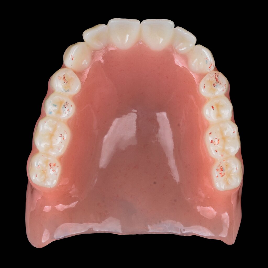 Stärkere Vorkontakte und störend ausgedehnte Bereiche der Prothesenbasen wurden unmittelbar entfernt. Abschließend wurden standardmäßig Ästhetik, Vertikaldimension und dorsale Extension der Basis erneut überprüft und zusammen mit dem Patienten besprochen. Durch den hier beschriebenen Workflow waren keine relevanten Diskrepanzen zwischen Try-in- und definitiver Prothese zu erwarten. Nach der Vereinbarung eines Kontrolltermins sowie der Aufklärung zur Prothesenhygiene und zu möglichen Komplikationen konnte der Patient mit neuen Prothesen entlassen werden.