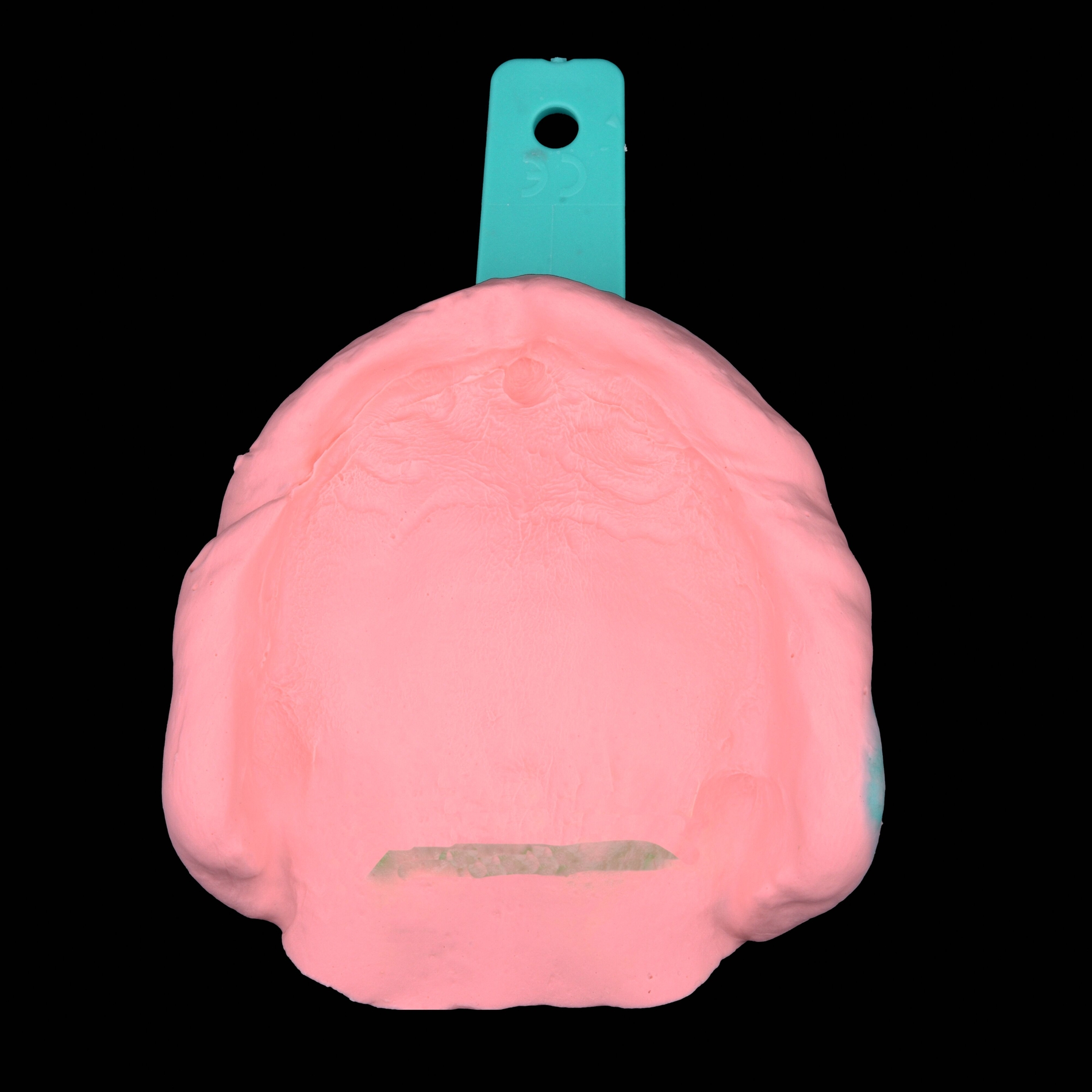 Um überextendierte Funktionslöffelränder zu vermeiden, wurde stets eine myodynamische Abformung durchgeführt. Zur Markierung der dorsalen Begrenzung (distal des Übergangs vom harten zum weichen Gaumen) im Oberkiefer eignet sich ein hochvisköser Farbindikator (Bio-Ink flow, Bausch, D). Der für den Prothesenhalt entscheidende Übergang zum weichen Gaumen wurde intraoral markiert und die Abformung des Oberkiefers erneut eingesetzt. Die Markierung sollte nach Entnahme der Abformung deutlich sichtbar sein.