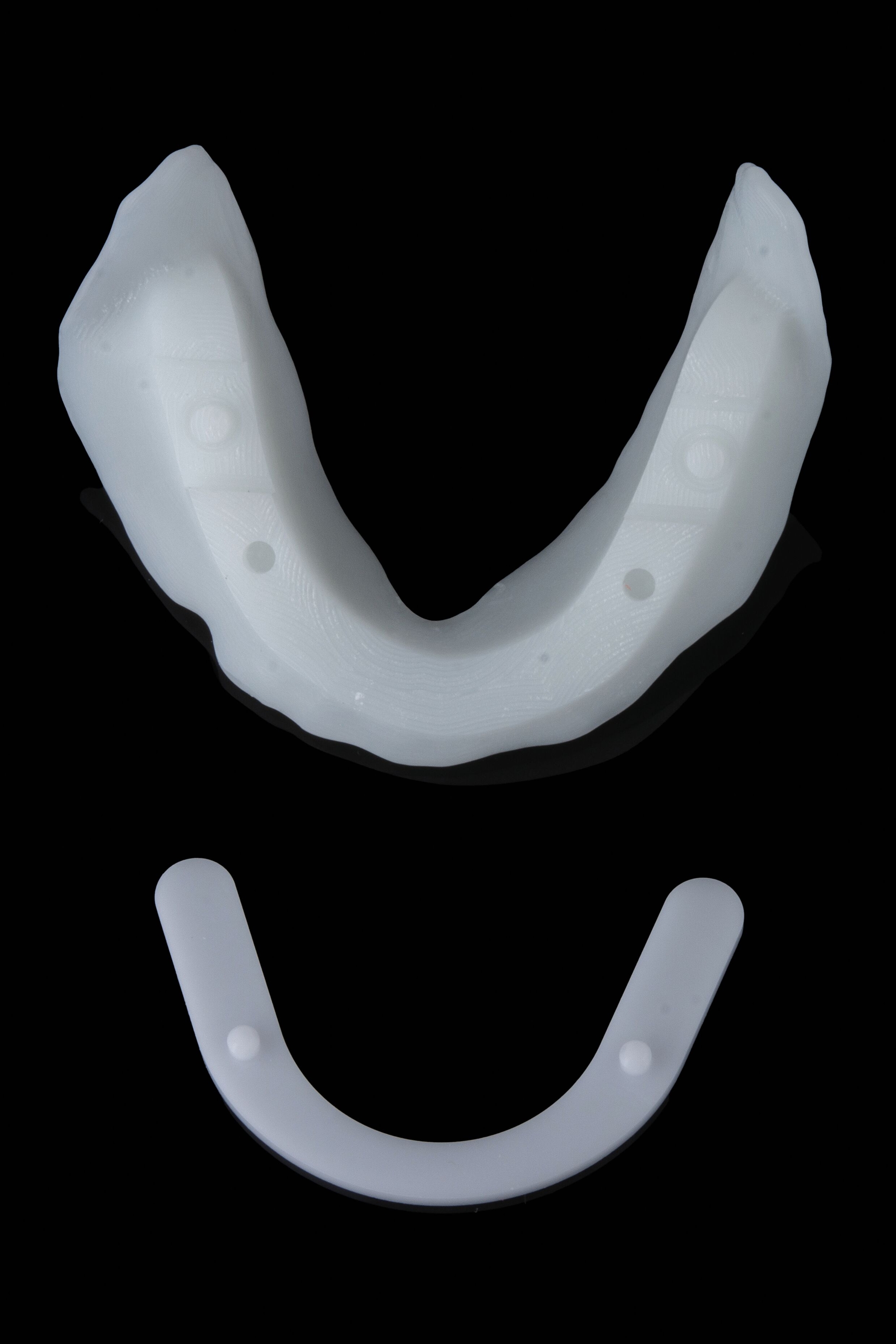 Die Anfertigung von Try-in-Prothesen war optional und kann je nach Komplexität des Falles und Routine in Erwägung gezogen werden. Die Anprobe konnte dabei als CAD/CAM-Pendant zur Wachsanprobe betrachtet werden. Formstabile und leicht fräsbare Kunststoffrohlinge (Pro Art CAD Try-in, Ivoclar Ivotion, Schaan, Liechtenstein) ermöglichten eine funktionelle und ästhetische Anprobe der digital gestalteten Prothesen bei kosteneffizientem Material (Abbildung 18).