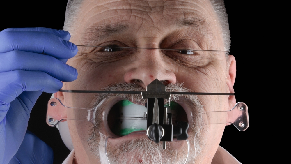 Zur Bestimmung der definitiven Okklusionsebene wurde der UTS-CAD, diesmal unter Zuhilfenahme einer Bissgabel, erneut angelegt und parallel zur Bipupillarlinie und zur Camper-Ebene ausgerichtet (Abbildung 9). Es wurde überprüft, ob die ermittelten Werte denen der vorangegangenen Sitzung entsprachen, und das Ergebnis wurde für das Labor zwecks Anpassung auf dem Auftragszettel notiert.