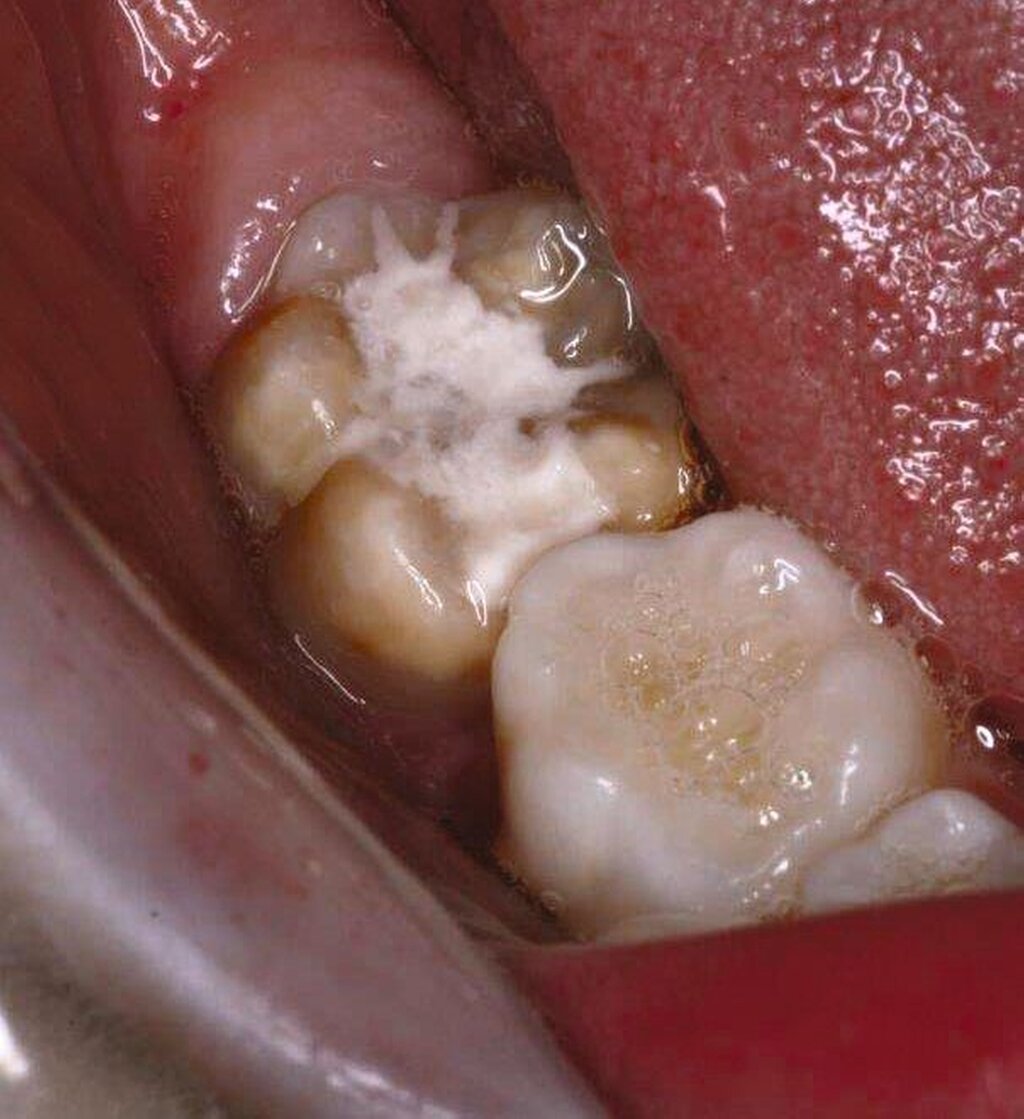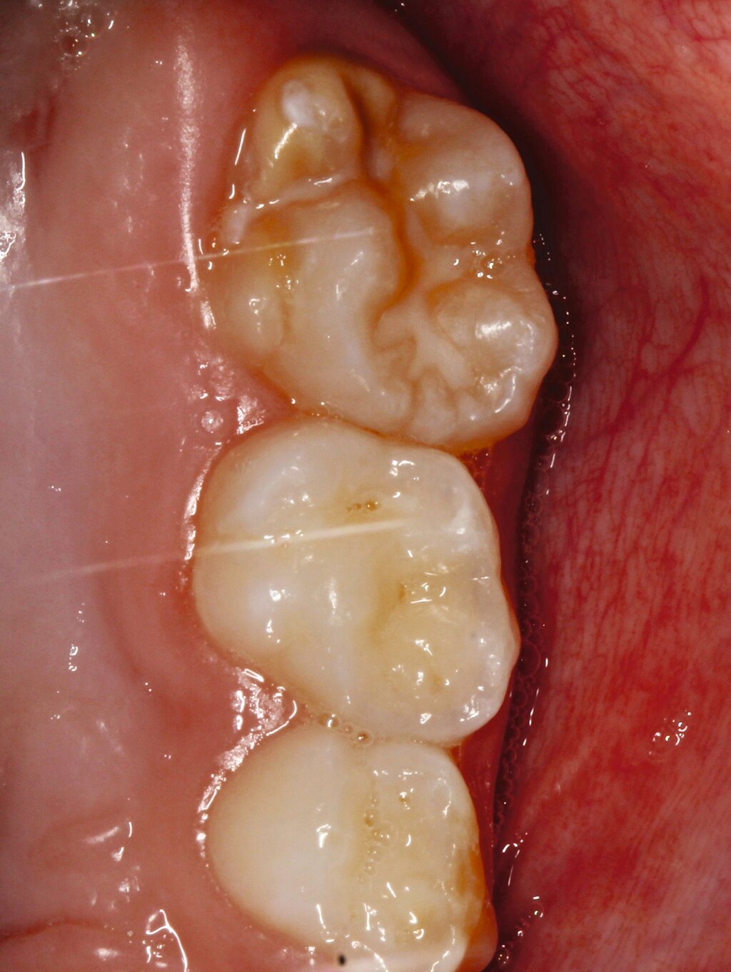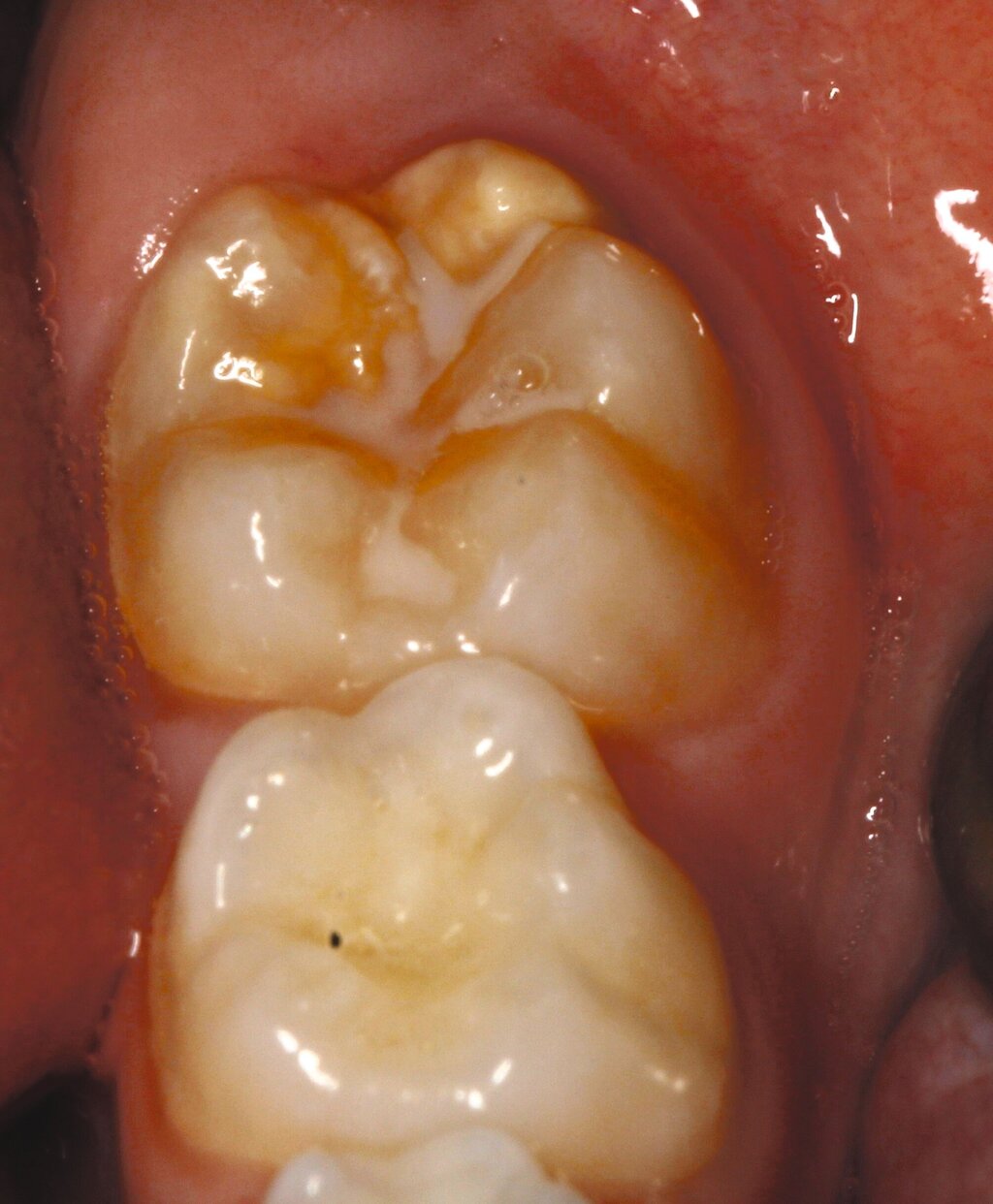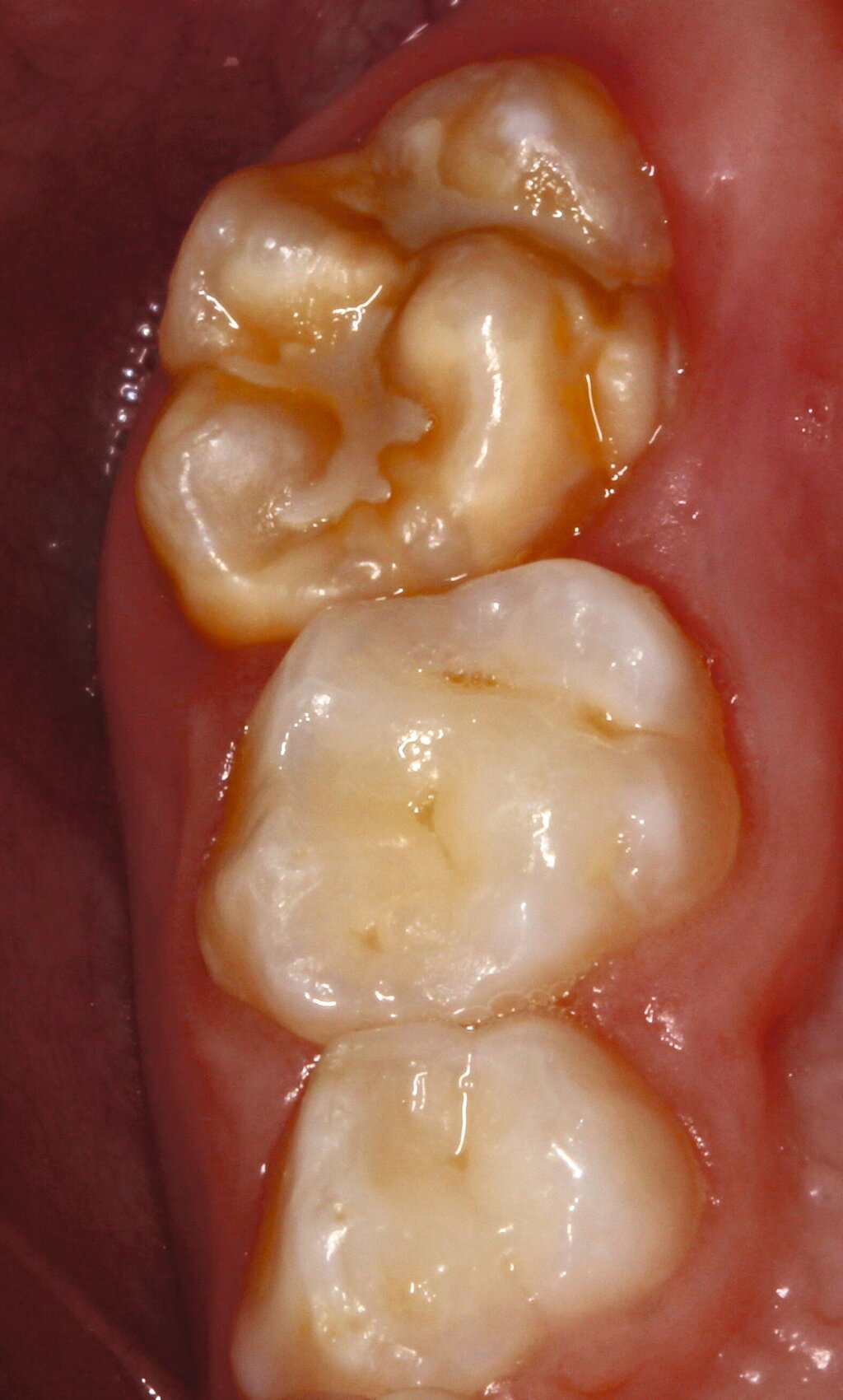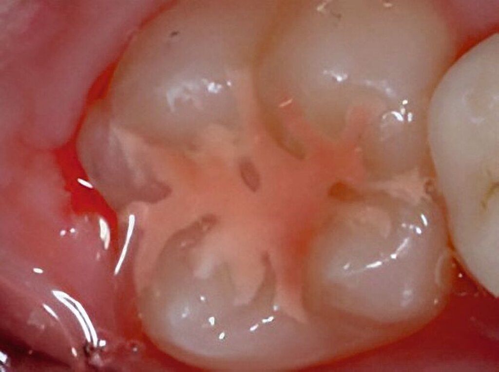 Häufig erfolgt aus verschiedenen Gründen (mangelnde Compliance, noch nicht vollständig durchgebrochene Zähne) eine Abdeckung vor allem hypersensibler MIH-Molaren mit einem Glasionomerzement (GIZ) in Form einer „temporären Fissurenversiegelung“ (Abbildungen 2 und 3), bevor – zum Beispiel nach vollständigem Durchbruch – eine klassische adhäsive Fissurenversiegelung durchgeführt wird.