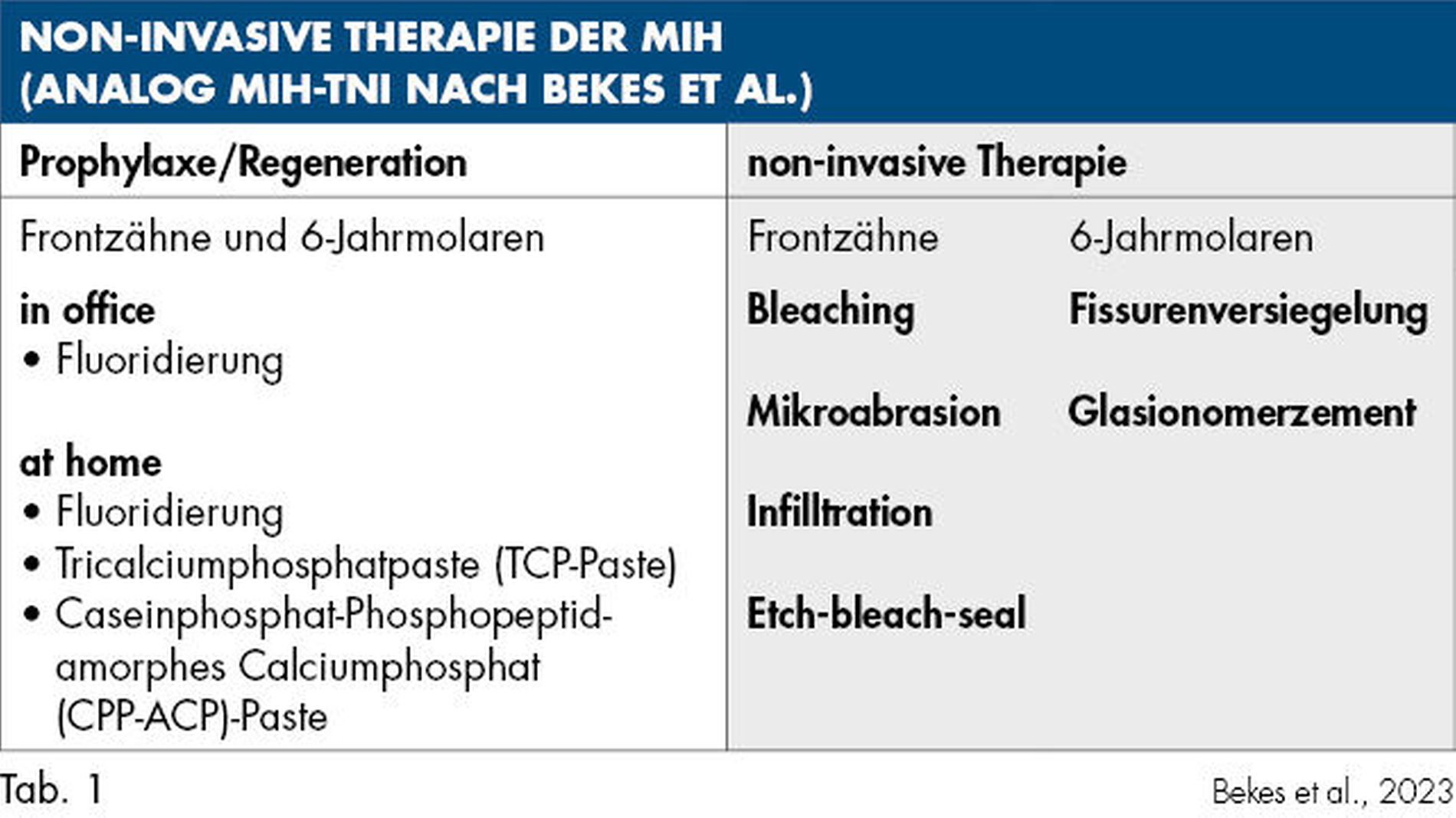 Patienten, die von MIH betroffen sind, sollten frühzeitig diagnostiziert und in ein engmaschiges zahnärztliches Betreuungsprogramm aufgenommen werden. Die Prophylaxe zu Hause sollte die Verwendung von fluoridhaltiger Zahnpasta und die unterstützende Anwendung von CPP-ACP-Präparaten umfassen. Die Überempfindlichkeit kann durch Fissurenversiegelung effektiv behandelt werden. Hinsichtlich der eingeschränkten Ästhetik der Frontzähne kann derzeit keine eindeutige Behandlungsempfehlung gegeben werden.