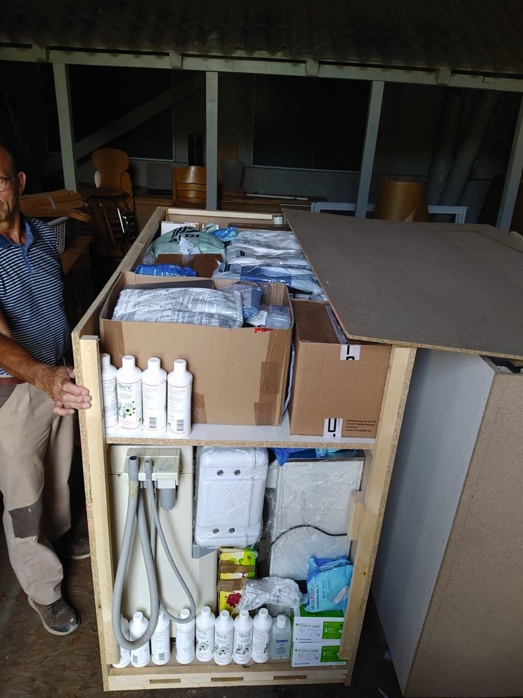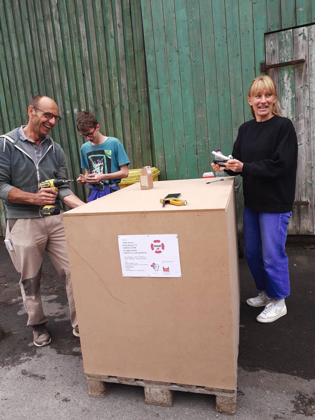 Beispiel Chios: Im Sommer 2021 eröffneten wir auf der griechischen Insel eine Zahnklinik im Flüchtlingslager Vial. Auch hier kamen ausschließlich gebrauchte Geräte aus Deutschland zum Einsatz, die wir sorgfältig verpackt in großen Holzkisten auf die Insel transportierten. Als wir das Lager im Dezember 2023 aufgrund politischer Entscheidungen verlassen mussten, wurden alle Materialien in Überseecontainern zwischengelagert. Mit der Wiedereröffnung der Klinik im Oktober 2025 stand die Frage im Raum: Was tun mit den massiven Kisten?