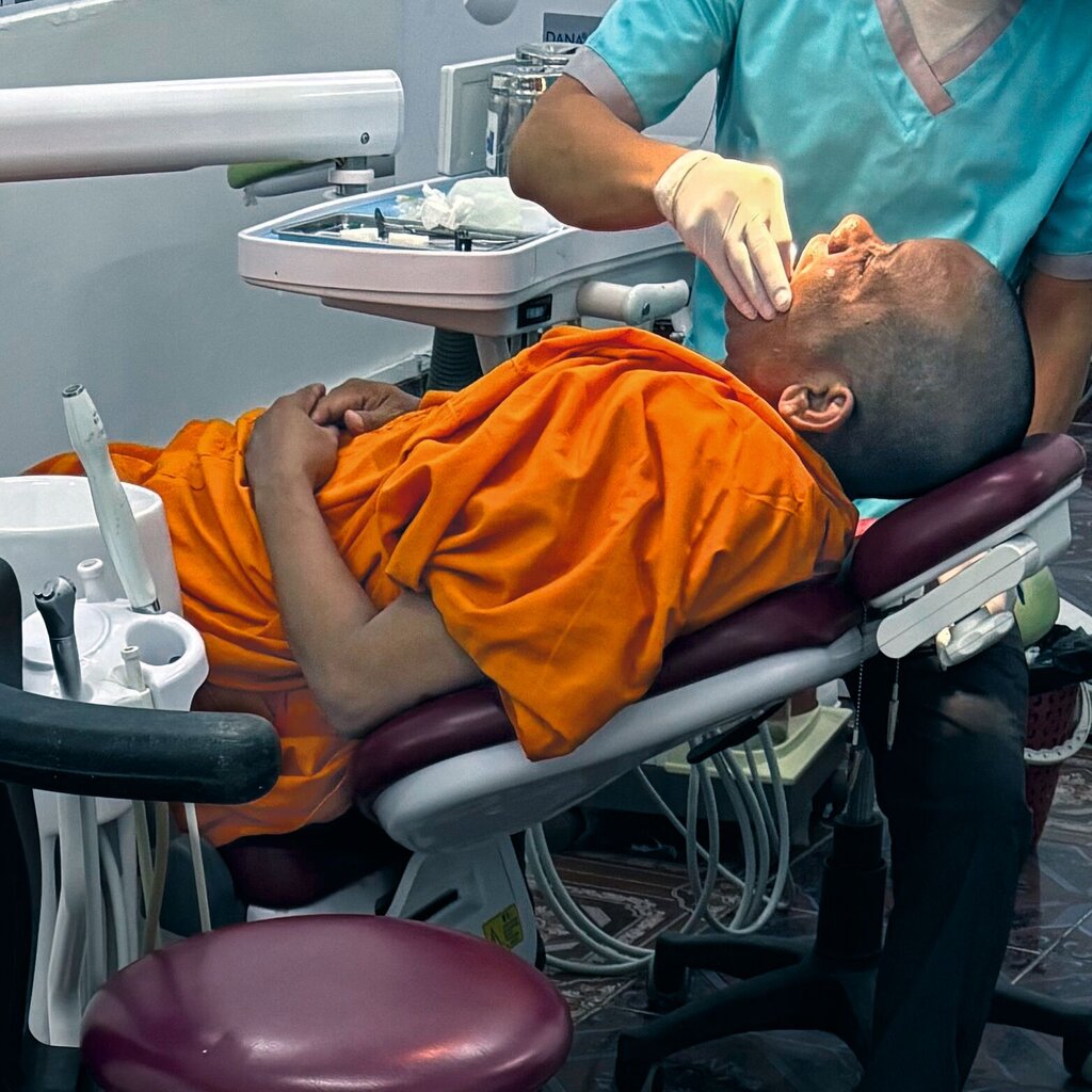 Mit vielen nützlichen Spenden im Gepäck – von Komposit über Zahnbürsten bis hin zu Zahnpasta und Zahnseide – reiste ich Ende 2025 für zwei Wochen Freiwilligenarbeit an. Die Mini-Molars-Klinik liegt tatsächlich auf einem Tempelgrundstück. Das Projekt existiert schon seit mehreren Jahren und besteht mittlerweile aus vielen einheimischen Helfern, wie Studenten, einem Zahnarzt und einem Manager. Mony ist zahnmedizinischer Fachangestellter und wurde mir für meinen Einsatz fest zugeteilt. Er zeigte mir die Räumlichkeiten und erläuterte die Abläufe, denn hier laufen Behandlungen nicht so wie bei uns in Deutschland.
