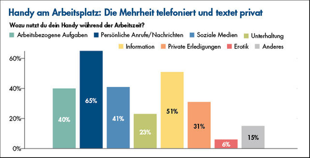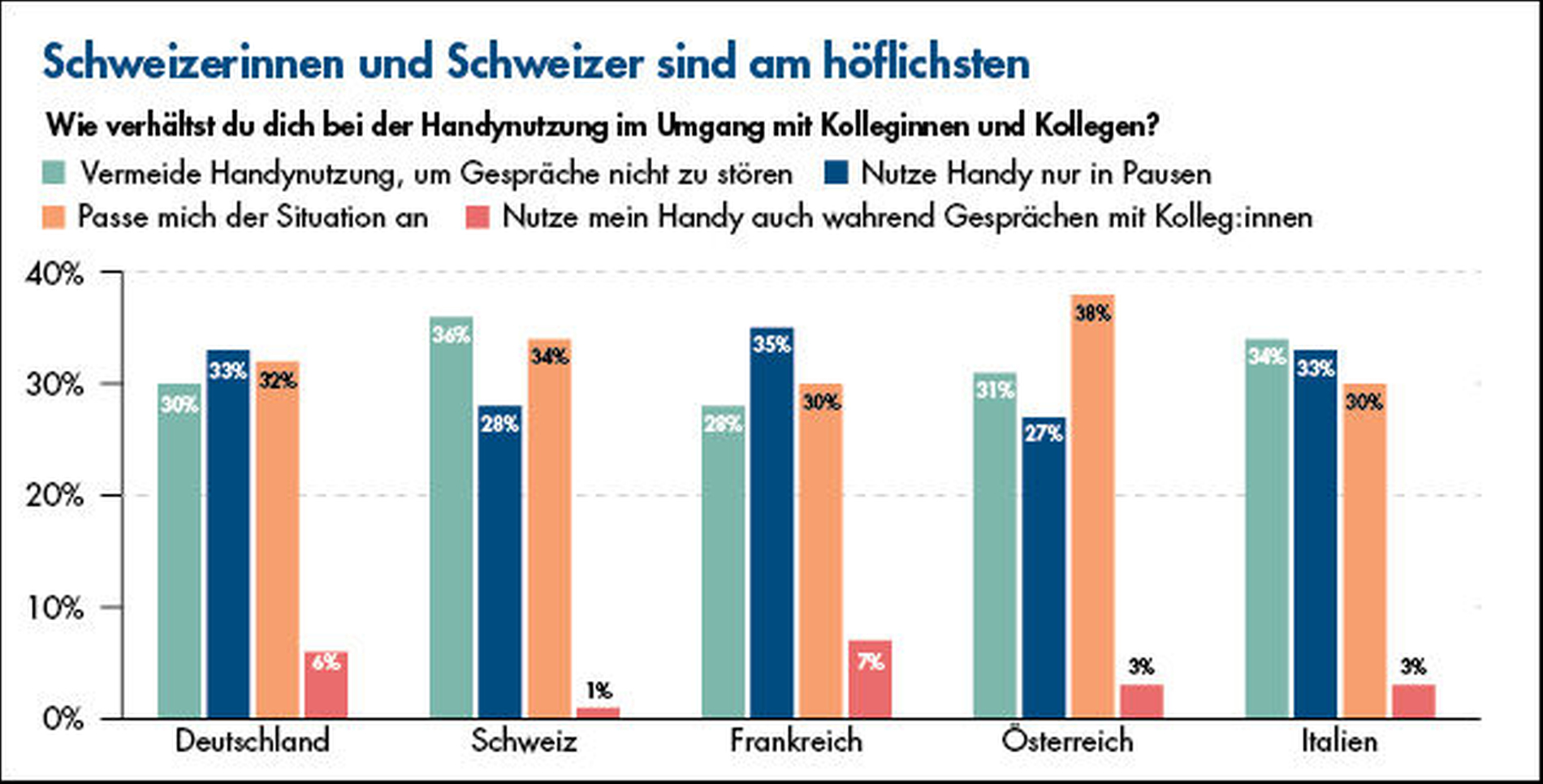 Private Nachrichten zu schreiben oder zu lesen ebenso wie private Anrufe zu führen, wird als am wenigsten störend wahrgenommen. Zwei Drittel der befragten Personen finden das okay. Was die Handynutzung in sozialen Situationen betrifft, sind Schweizerinnen und Schweizer am höflichsten: 36 Prozent gehen nicht ans Handy, um Gespräche nicht zu stören. Nur eine von 100 Personen greift inmitten der Unterhaltung zum Telefon. In Frankreich ist man gelassener: Zwar nimmt gut jede vierte Person Rücksicht im Umgang mit Kolleginnen und Kollegen, doch sieben Prozent der Französinnen und Franzosen nutzen ihr Handy in Gesellschaft wie gewohnt.