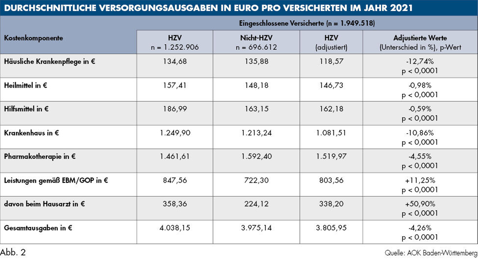 Laut AOK BW lagen die Mehrausgaben im primärärztlichen Sektor 2021 für HZV-Versicherte bei 50,9 Prozent. Bei den Gesamtausgaben über alle Versorgungsbereiche ergaben sich jedoch für HZV-Versicherte 4,3 Prozent niedrigere Ausgaben im Vergleich zur Kontrollgruppe der Nicht-HZV-Versicherten. Dieser Unterschied sei vor allem auf geringere Kosten im stationären Bereich sowie bei den Arzneimitteln zurückzuführen – beides die Kostentreiber im Gesundheitswesen.