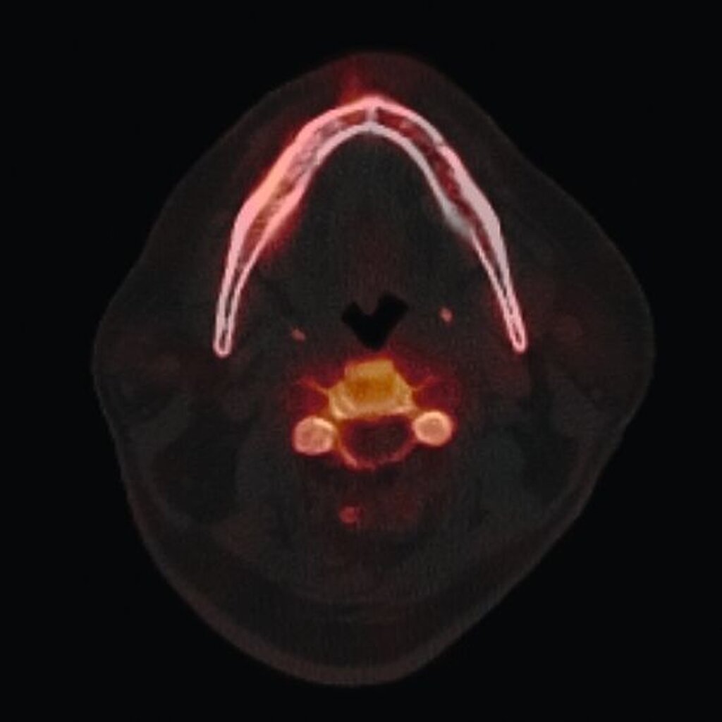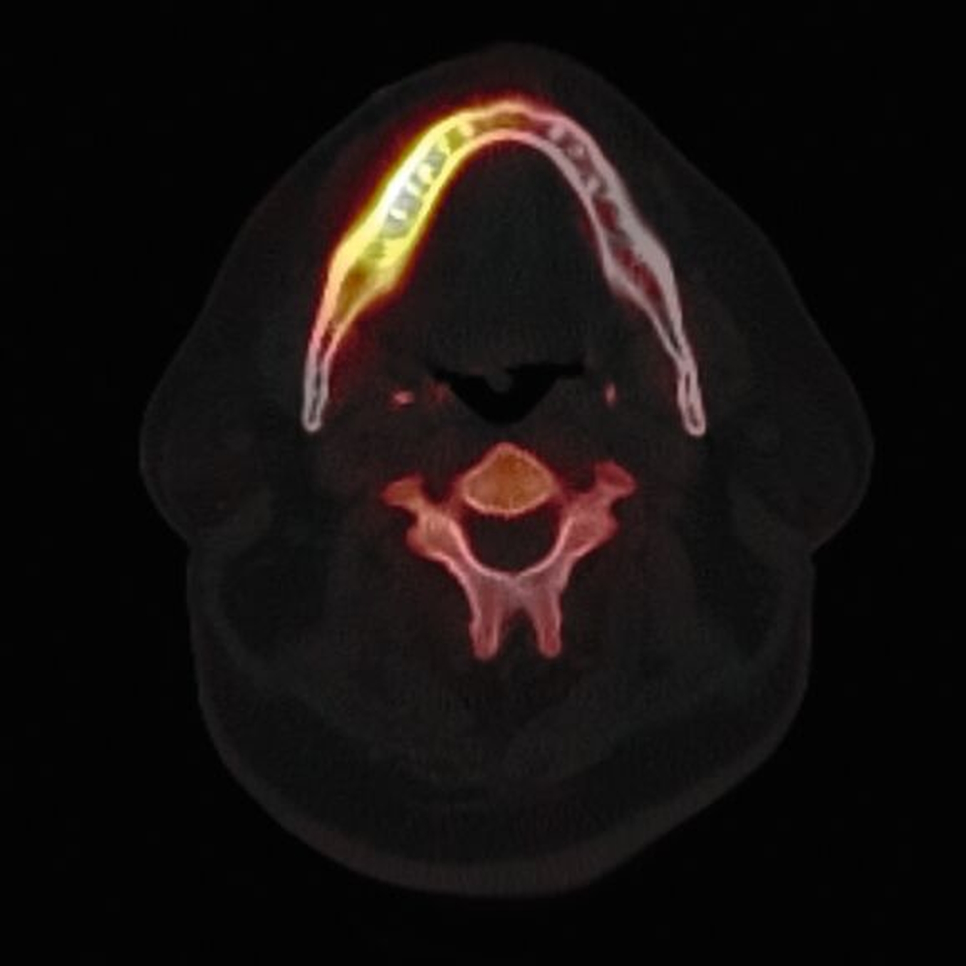 Zum Zeitpunkt der Erstvorstellung in der kieferchirurgischen Ambulanz zeigten sich keine klassischen Herpes-Zoster-Effloreszenzen im Gesicht. Eine antiresorptive Therapie oder Bestrahlung lag nicht vor, sodass eine Herpes-Zoster-assoziierte Osteonekrose im Sinne einer Ausschlussdiagnose festgestellt wurde. Anamnestisch bestand ein gut eingestellter Diabetes mellitus Typ 2 als potenziell immunkompromittierende Grunderkrankung. Die Knochenszintigrafie zeigte eine deutliche Stoffwechselsteigerung im betroffenen Bereich, vereinbar mit einer infizierten Osteonekrose.
