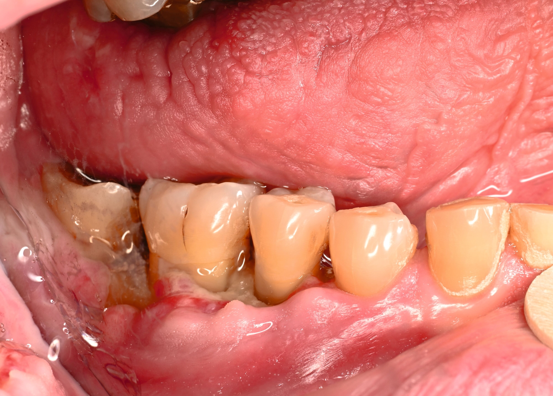 Der Patient stellte sich mit freiliegendem Knochen in Regio 43 bis 47 und mehreren gelockerten Zähnen vor. 45 und 46 waren devital. Als klinische Besonderheit fiel auf, dass sich innerhalb der Nekrosezone kleinflächige Weichgewebsareale darstellten, die in dieser Form bei klassischen Osteonekrosen üblicherweise nicht beobachtet werden. Eine klassische Vincent-Symptomatik bestand nicht. Drei Wochen zuvor war eine Herpes-Zoster-Infektion dermatologisch diagnostiziert und zunächst stationär behandelt worden. Der Patient erhielt eine intravenöse, antivirale Therapie, die bei Entlassung oralisiert wurde.
