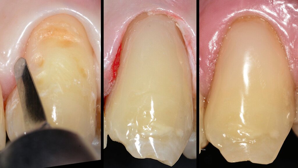 Die sklerosierte Dentinoberfläche der Kavität wurde mit rotierenden Diamantschleifern aufgefrischt. Mit einem kugelförmigen Diamantschleifer wurde eine feine, muldenförmige Akzentuierung des Randes vorgenommen. Der zervikal exponierte Anteil der Wurzeloberfläche wurde mit oszillierenden, diamantbelegten Feilen gereinigt und angefrischt. Die Verwendung von Feilen im epigingivalen Bereich erlaubt eine schonende Vorgehensweise ohne Verletzung der Gingiva.