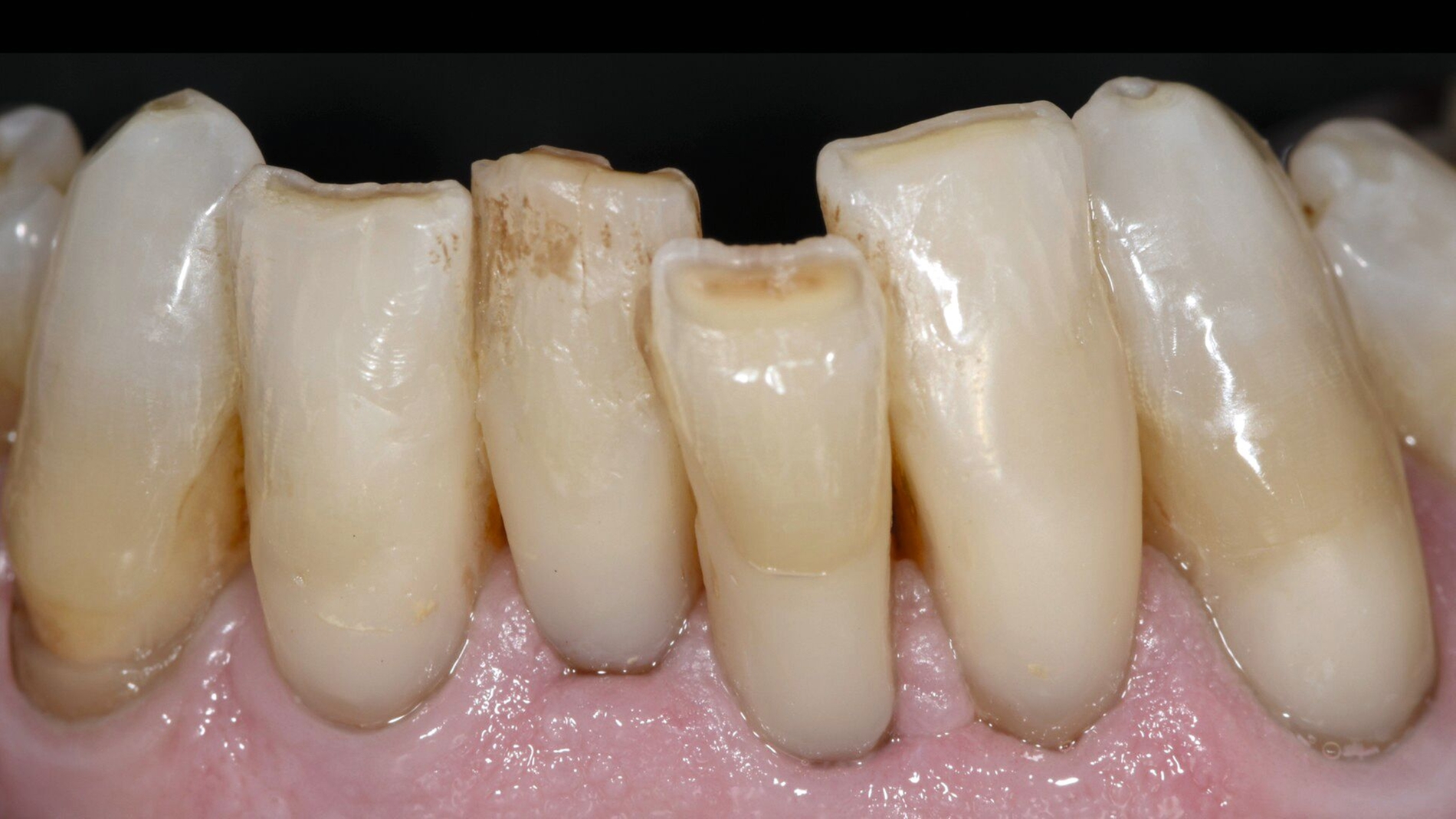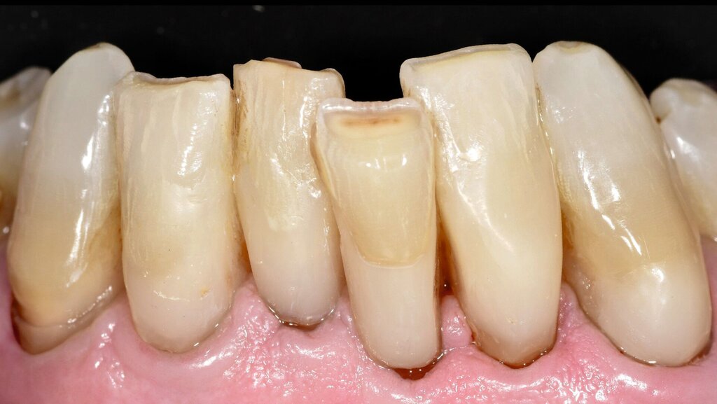 Mit zunehmendem Alter hatte der Patient allerdings Mühe, die schwer zugänglichen Defekte adäquat zu reinigen. Zudem musste man befürchten, dass es bei weiterem Abbau der Zahnhartsubstanz in diesen Bereichen zu einem Verlust der Zahnintegrität oder einer Pulpaexposition kommt. Daher wurde entschieden, die besonders stark betroffenen Zähne 31, 32, 41 und 42 mit Kompositrestaurationen im Zahnhalsbereich zu versorgen.