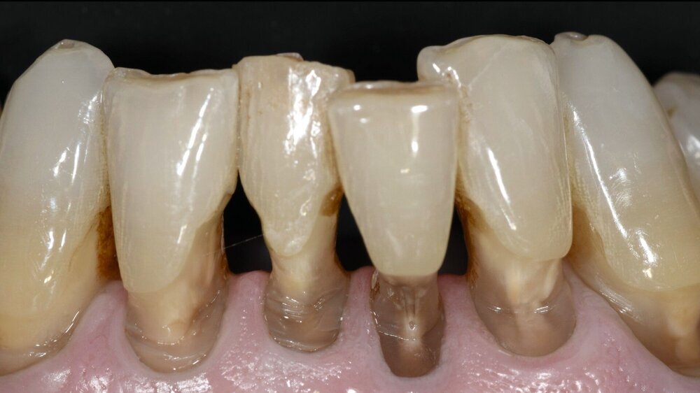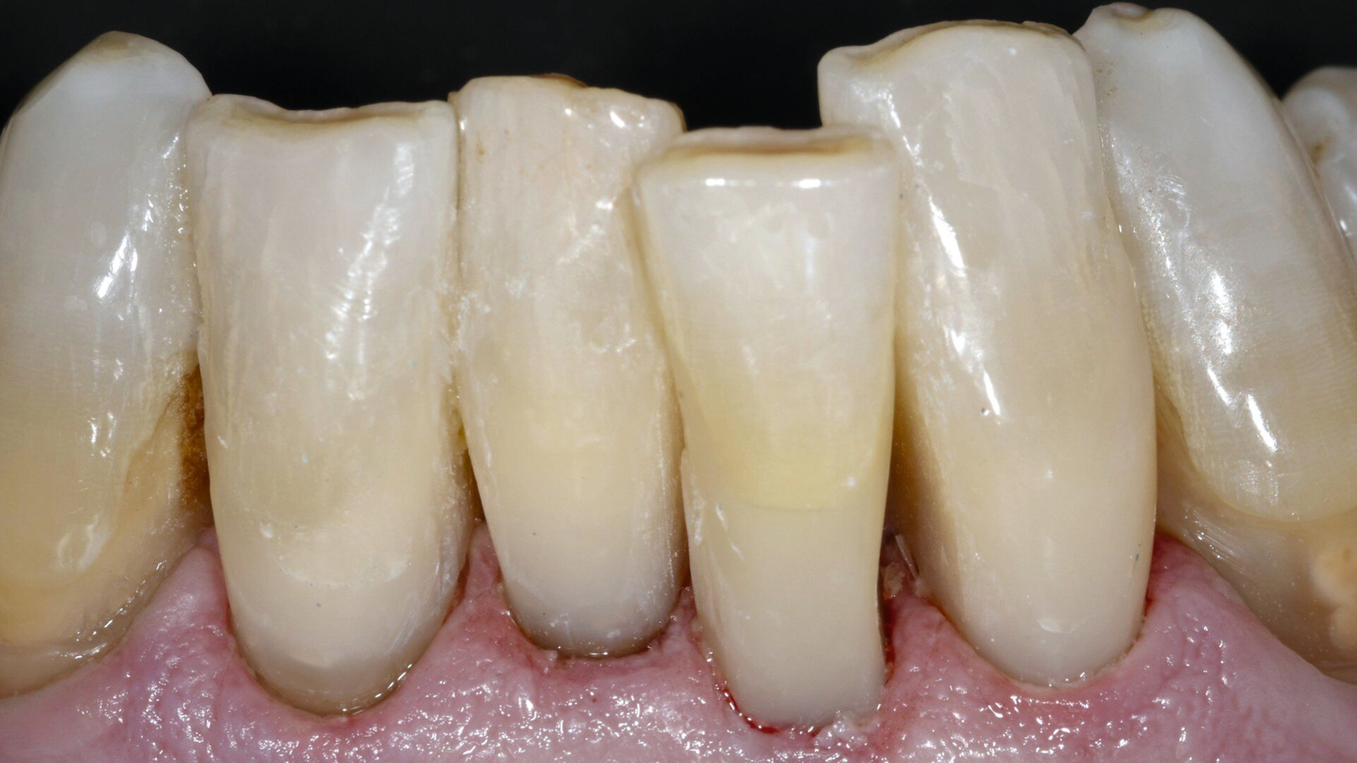 Die Zähne reagierten positiv auf einen Sensibilitätstest mit Kältespray und wiesen Sondierungstiefen von 2-3 mm Tiefe auf. Die Zähne wurden wie nachfolgend beschrieben versorgt. Nach fünf Jahren Beobachtungszeit sind die Restaurationen des nun 80-jährigen Patienten bis auf kleine Defekte im zervikalen Anteil als akzeptabel einzustufen. Die Gingiva weist eine über die Beobachtungszeit leicht progrediente Rezession auf.