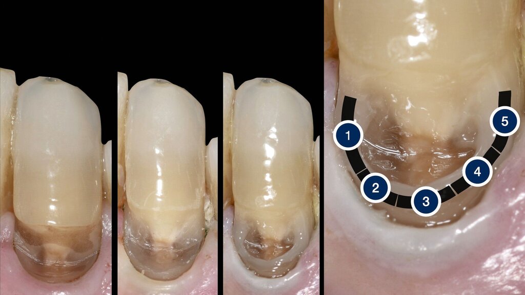 Die fertige „Wanne“ dient quasi als eine Art Matrize während der folgenden Schritte. Die Technik eignet sich somit nicht nur für Klasse-V-Kavitäten, sondern für alle direkten Restaurationen, bei denen zunächst kritische (zum Beispiel Gingiva-nahe) Bereiche gezielt aufgebaut und versiegelt werden, bevor weitere Füllungsschritte erfolgen.