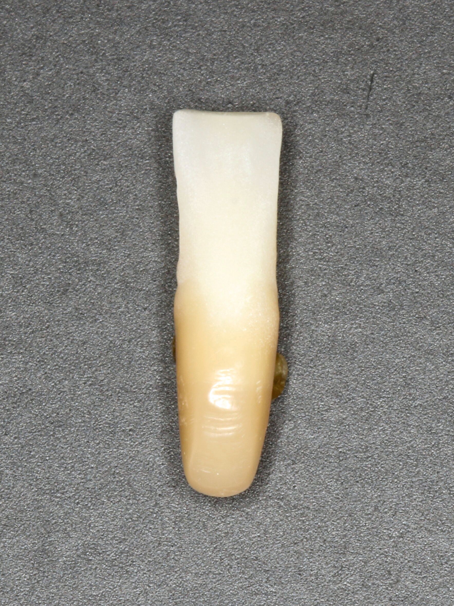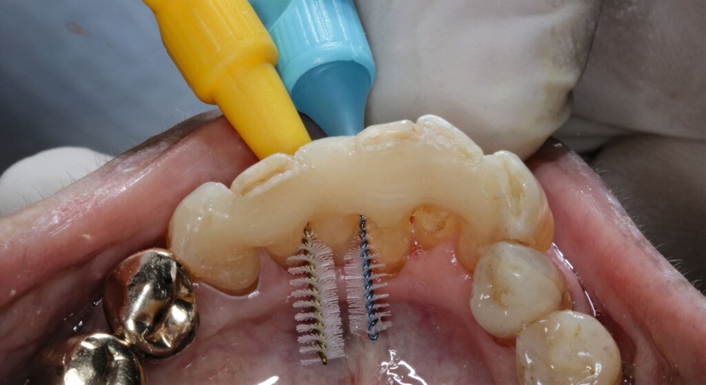 Im Anschluss erfolgte die Bearbeitung des Prothesenzahns im zahntechnischen Kliniklabor mittels Korund-Sandstrahlen (50 μm) und die Vorbereitung der gestrahlten Oberfläche mit einem Einkomponenten-Haftvermittler (Monobond Plus, Ivoclar Vivadent) sowie Adhäsiv (Optibond FL, Kerr).