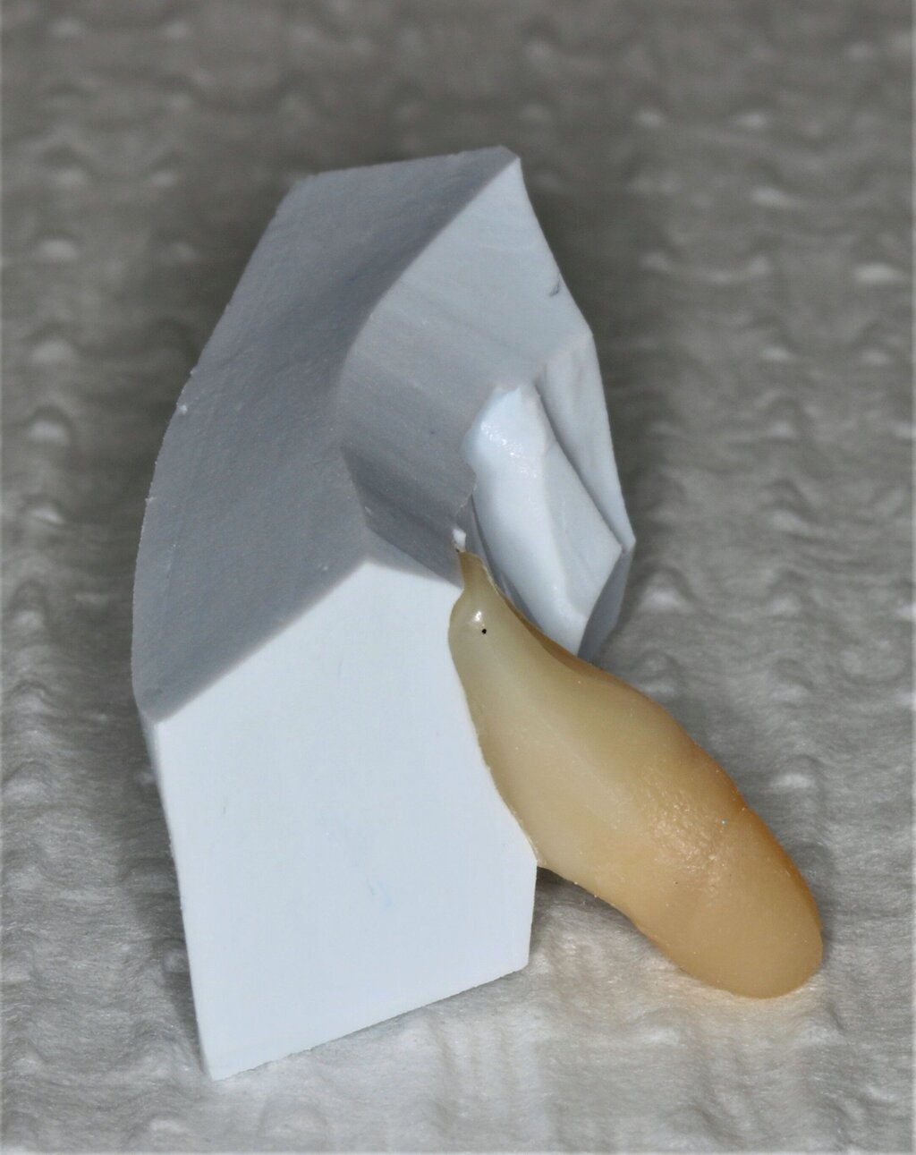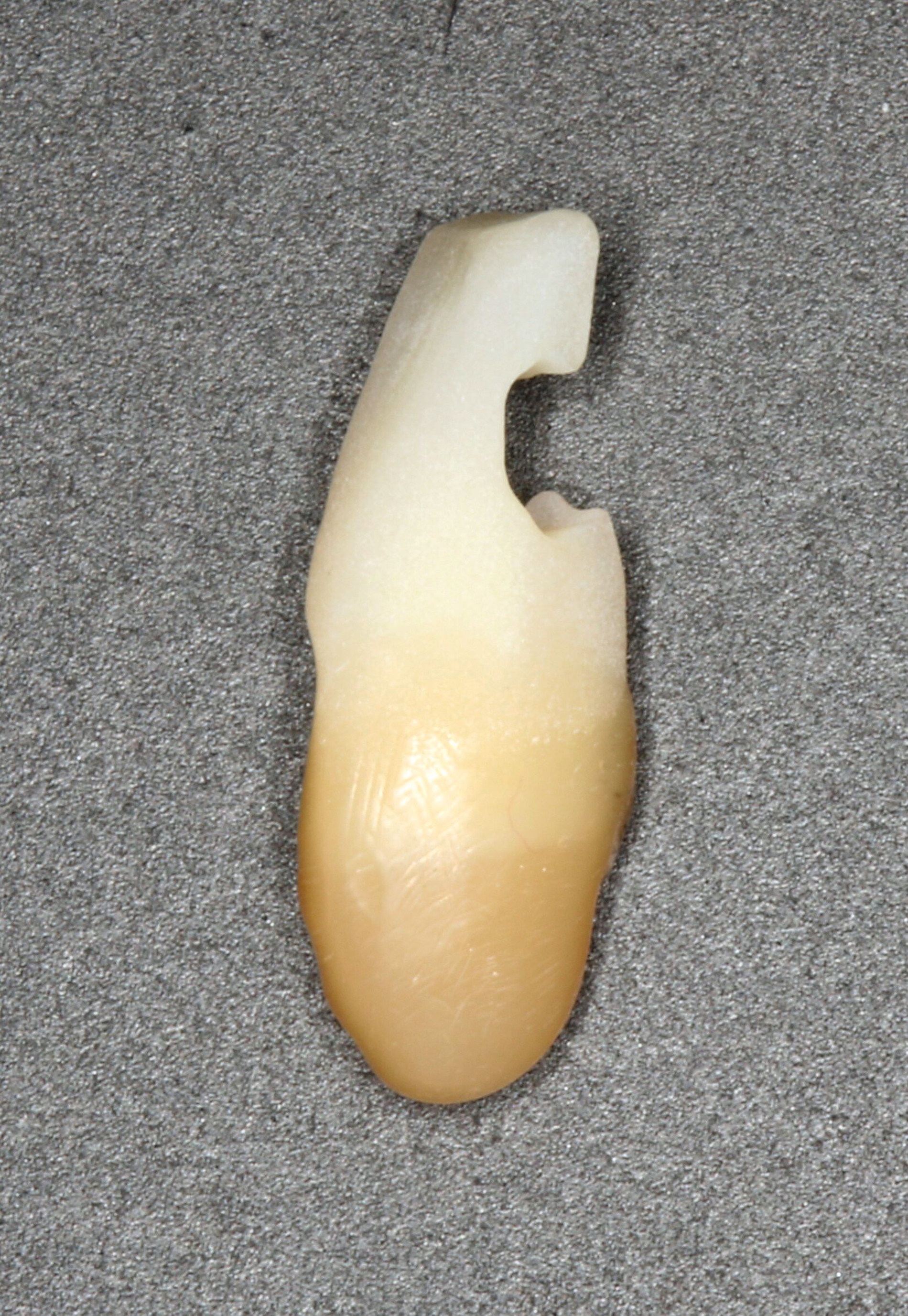 Als Vorbereitung wurde die Zahnoberfläche zunächst mittels Ultraschallscaler und Pulverwasserstrahlgerät (Airflow Prophylaxis Master, EMS) von Zahnstein und Belägen gereinigt, anschließend ein so gut wie möglich passender Kunststoff-Prothesenzahn (Vitapan, Vita Zahnfabrik) ausgewählt und mittels rotierender Instrumente am Behandlungsplatz der Lücke angepasst.