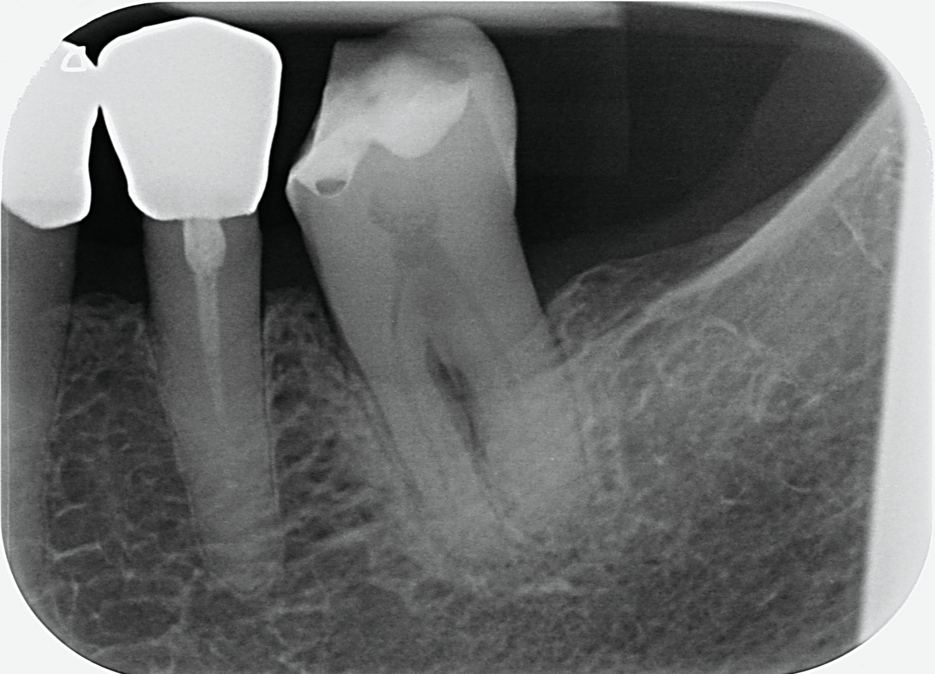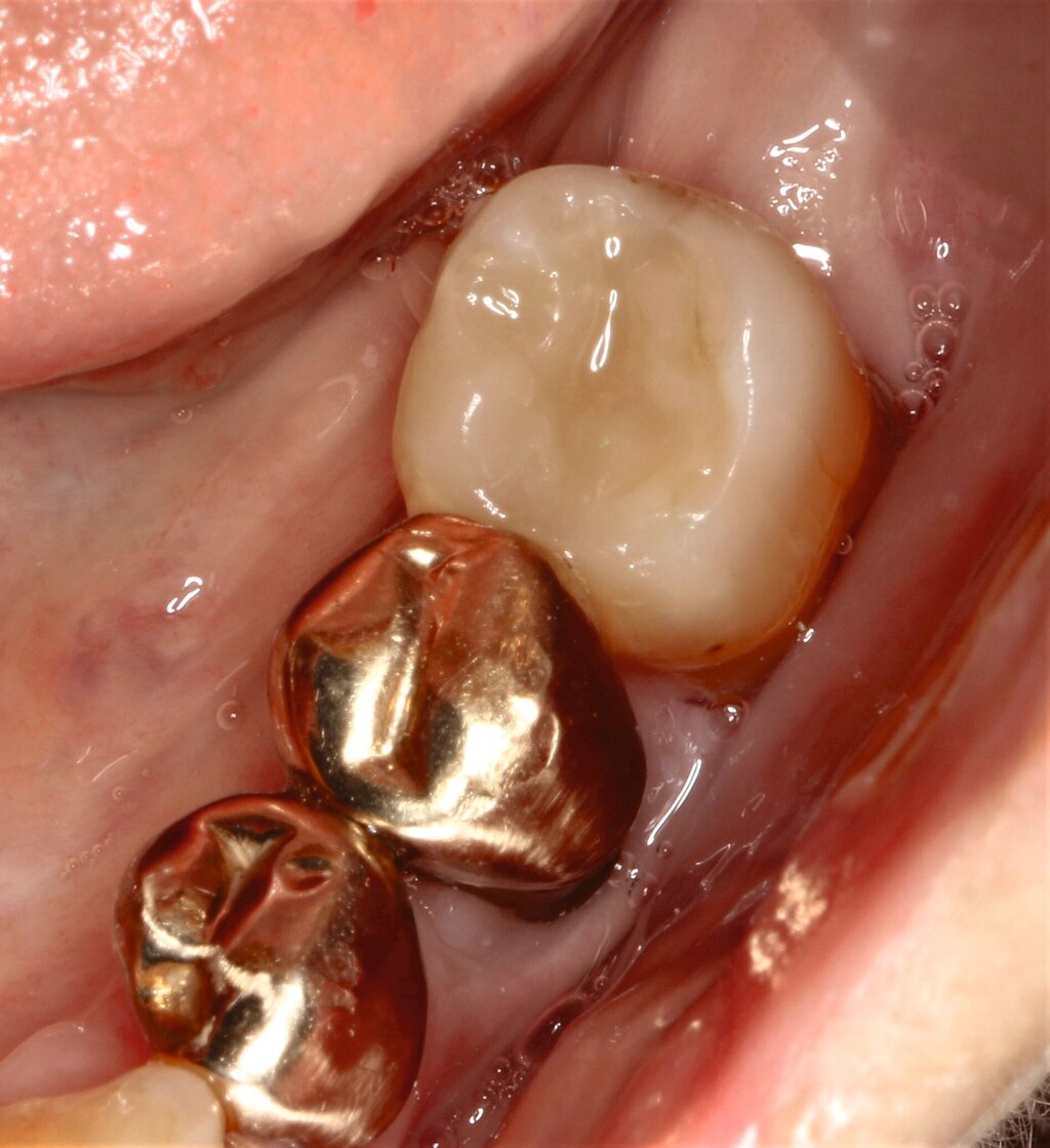 Die hochbetagte Patientin war bereits viele Jahre in der Poliklinik für Zahnerhaltung des Universitätsklinikums Tübingen zahnmedizinisch betreut worden, allerdings aus Sorge vor einer Corona-Infektion von Ende 2019 bis August 2023 knapp vier Jahre der zahnärztlichen Versorgung ferngeblieben. Grund der Wiedervorstellung war dann ein wenige Tage zuvor stattgefundener Füllungsverlust am Zahn 36. Hier bemerkte die Patientin eine an der Zunge störende scharfkantige Fraktur des Molaren (Abbildungen 2 und 3). Weitere Schmerzen oder Beschwerden gab sie nicht an. Im Rahmen der zahnärztlichen Untersuchung konnten multiple Rezessionen und diverse arretierte Brown-Spot-Läsionen festgestellt werden.