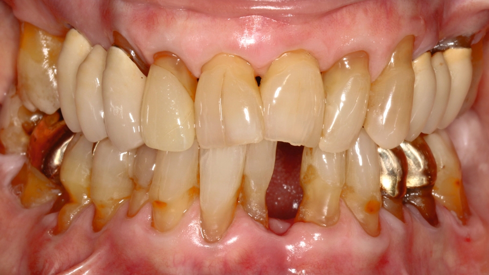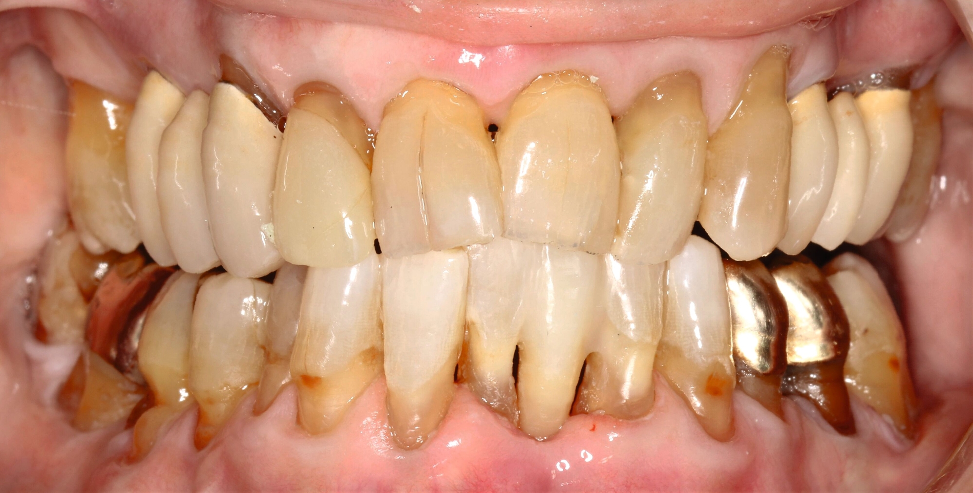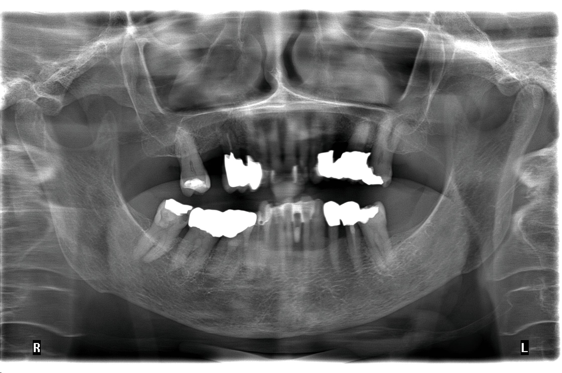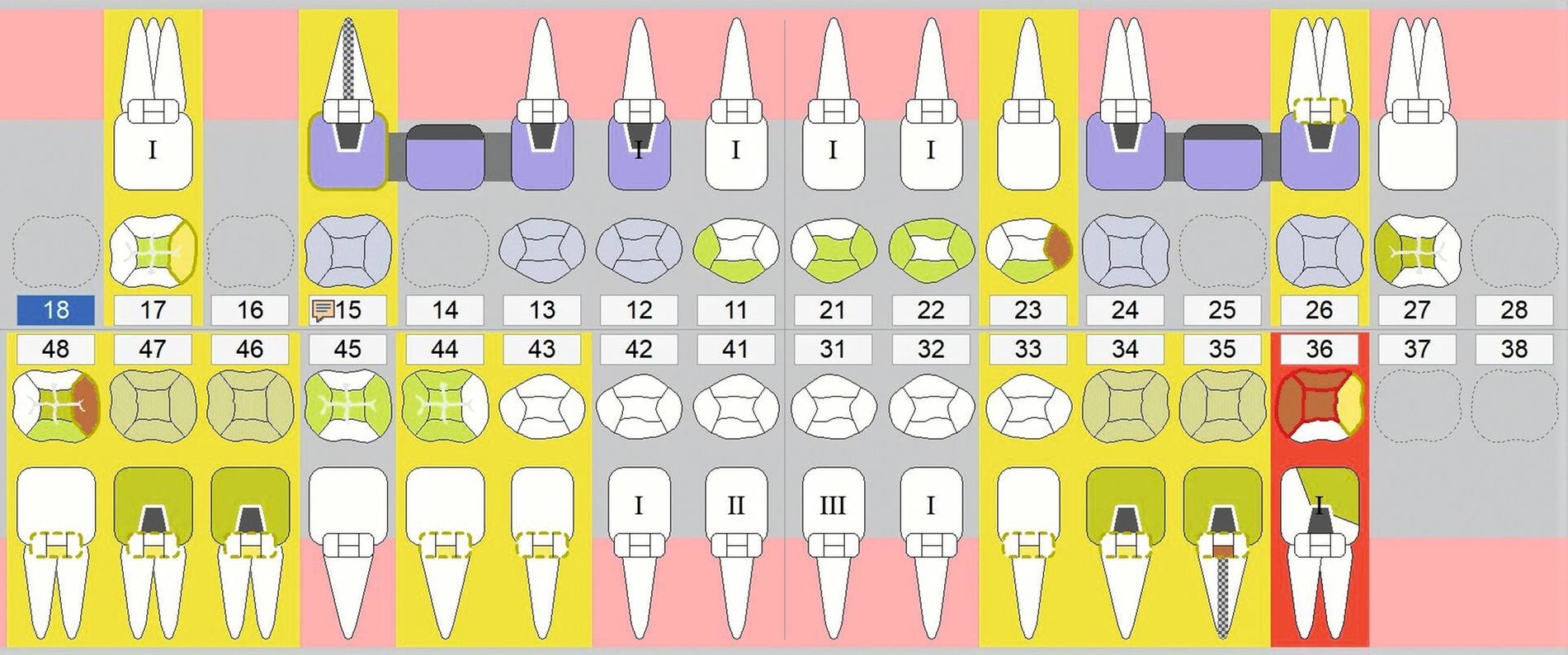 Allgemeinanamnestisch zeigte die Patientin neben einer diagnostizierten Herzinsuffizienz, einer medikamentös behandelten, stabilisierten Angina pectoris und einer Niereninsuffizienz auch eine fortgeschrittene Wirbelsäulenarthritis, wodurch längeres, nach hinten gelehntes Sitzen auf dem Behandlungsstuhl für die Patientin schmerzhaft war und ihre Adhärenz für längere Sitzungen deutlich reduzierte.