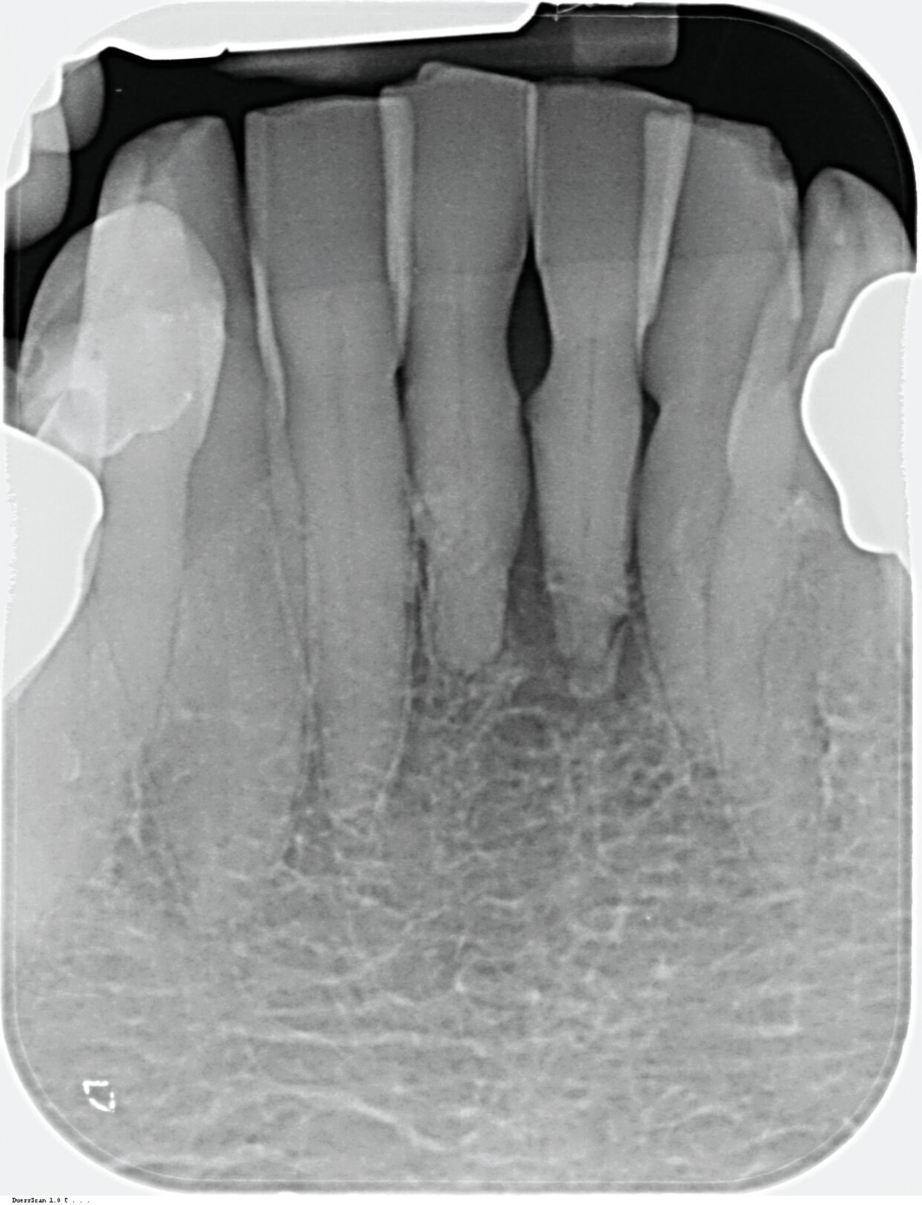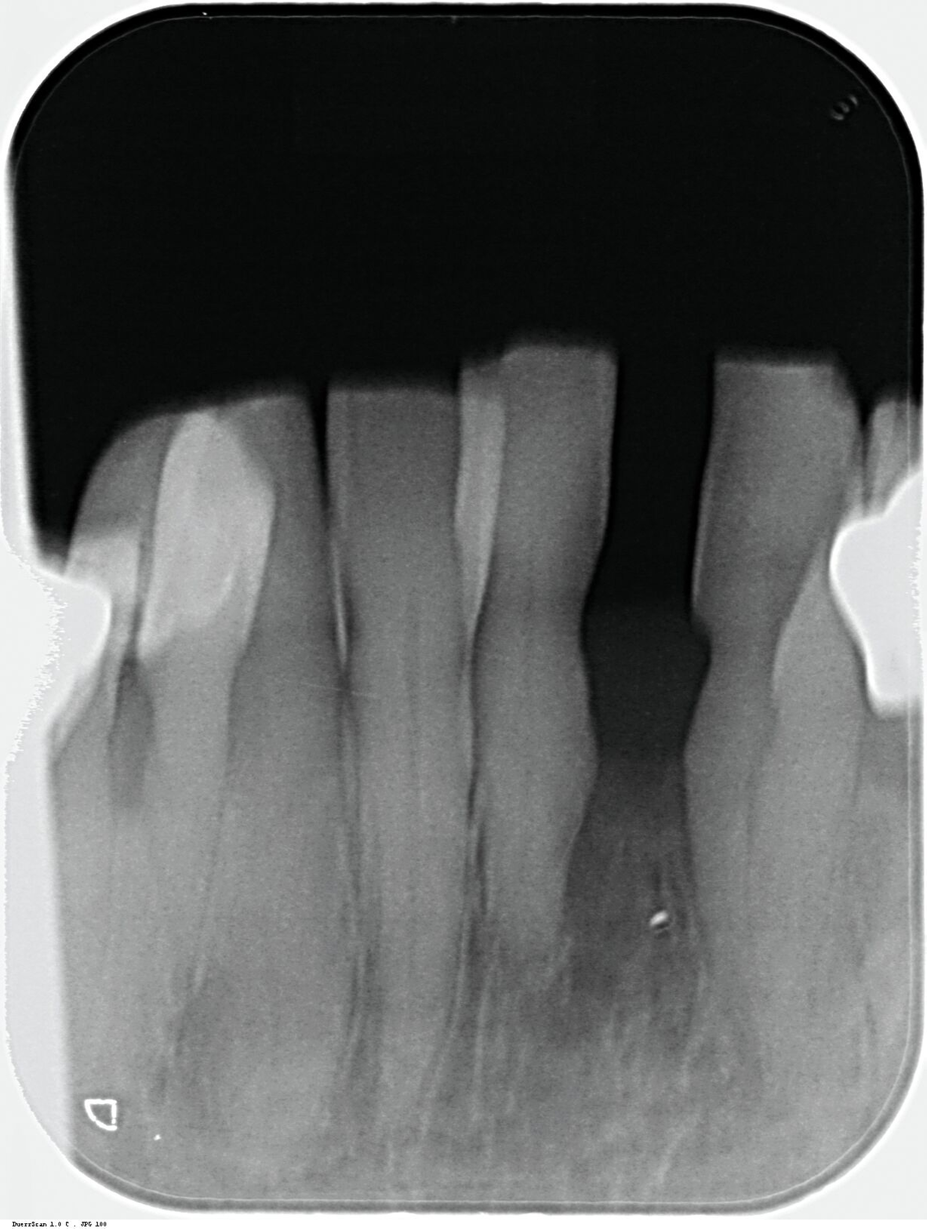 Da anhand eines Zahnfilms festgestellt worden war, dass der Zahn 31 – vermutlich aufgrund einer Paro-Endo-Läsion – eine apikale Aufhellung zeigte, war bereits die Extraktion mit anschließender Umarbeitung und adhäsiver Wiedereingliederung des extrahierten Zahnes als Option angesprochen worden. Kurz vor dem vereinbarten Eingriff meldete sich die Patientin telefonisch, um sich zu erkundigen, ob sie den Termin denn überhaupt noch benötige, da der betroffene, gelockerte Zahn 31 in der Unterkieferfront beim Essen von selbst herausgefallen sei und sie ihn bereits entsorgt habe. Schmerzen, eine Schwellung oder Nachblutungen verneinte die Patientin. Sie wurde gebeten, den vereinbarten Termin am Folgetag dennoch wahrzunehmen, mindestens zur Kontrolle der Wunde, gegebenenfalls zur Planung der Weiterversorgung (Abbildungen 5 und 6).