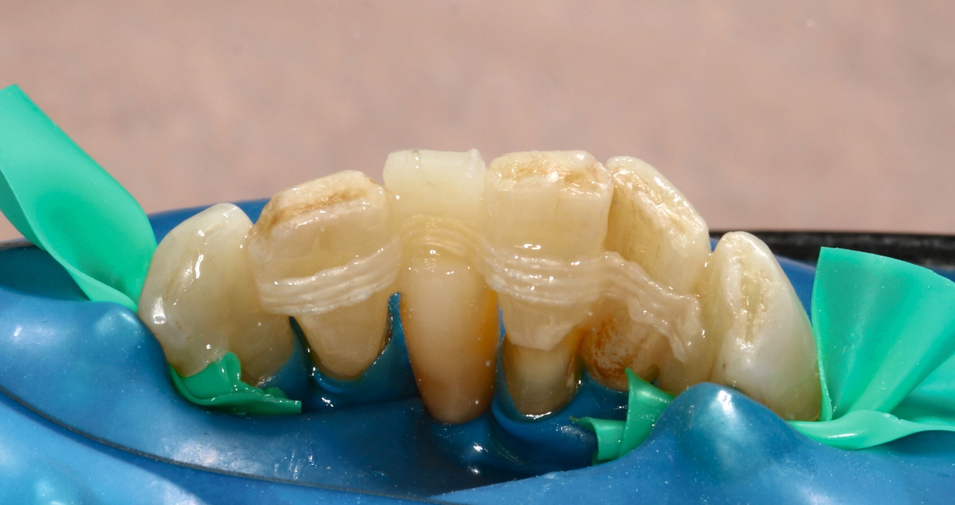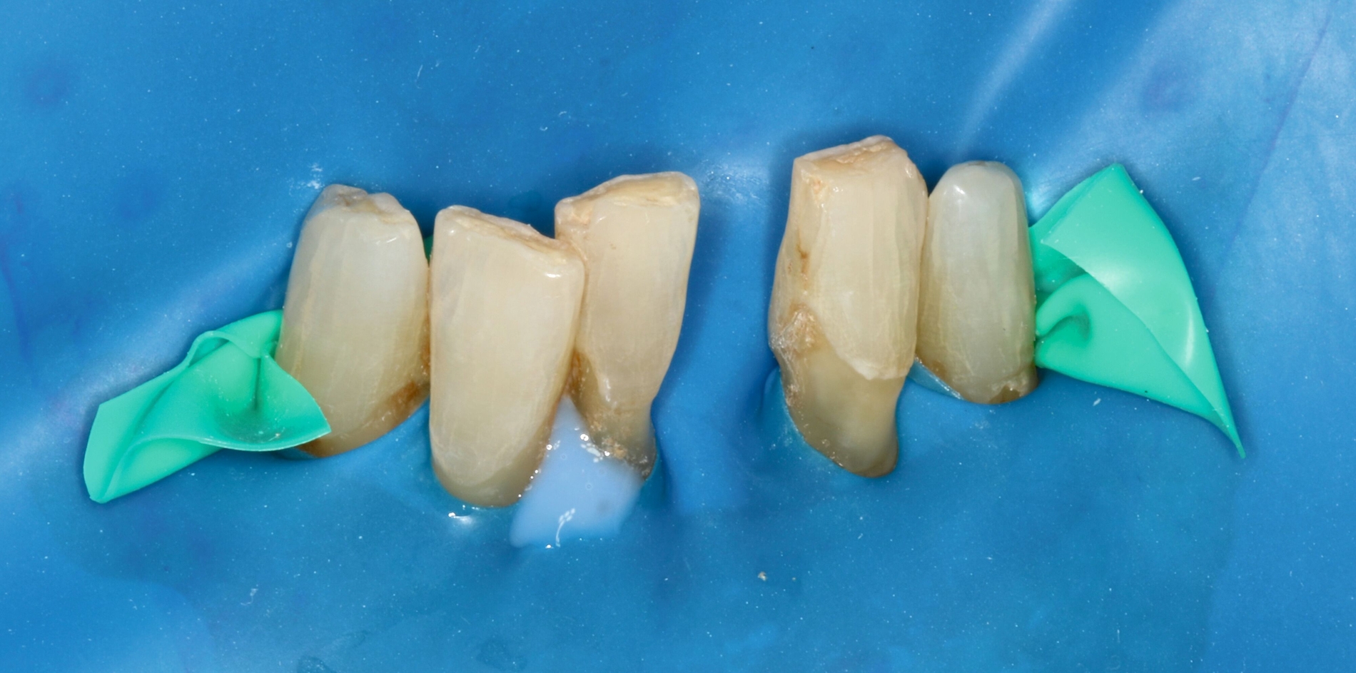 Um bei der adhäsiven Befestigung des Kunststoff-Prothesenzahns das Risiko einer Speichelkontaminierung zu reduzieren, wurde Kofferdam verwendet. Die Interdentalräume wurden mit einer elastischen Befestigungsschnur (Wedjets, Coltene) blockiert, um ein späteres Ausfließen der Interdentalräume mit Komposit zu verhindern – einerseits um weiterhin eine gute häusliche Mundhygiene zu ermöglichen, andererseits um keine unnötig langwierige Nacharbeitung bei der Entfernung von überschüssigem Komposit zu verursachen (Abbildung 9).