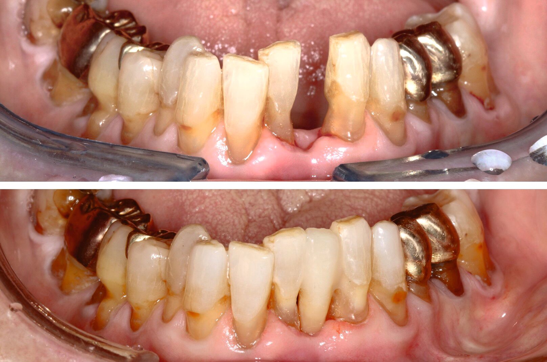 Zu dem in diesem Patientenfall dargestellten Anbringen eines konfektionierten Prothesenzahns im Rahmen einer parodontalen Schienung bei vorhandener Lückensituation ist die Datenlage dagegen sehr spärlich, es finden sich lediglich wenige Daten zu Schienungen mit extrahierten, wiederbefestigten Zähnen – sogenannten „Immediate“ oder „Ovate Pontics“. Deren eigentliche Anwendung ist die temporäre Versorgung von Lückensituationen, zum Beispiel vor einer weiteren prothetischen Versorgung [Dimaczek & Kern, 2008] oder bei der Versorgung von Patienten mit einer schwer verlaufenden Parodontitis und den daraus entstehenden Lückensituationen [Rana et al., 2025].