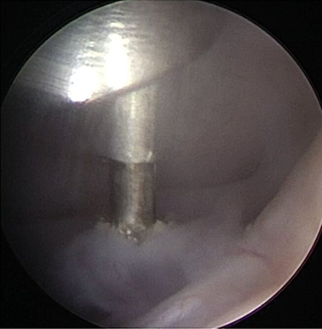 Im Rahmen einer Level-II-Arthroskopie (Abbildung 8) in Vollnarkose konnte der Gelenkkörper nach Zerkleinerung durch Coblation über einen Arbeitskanal vollständig entfernt werden. Die histologische Aufarbeitung ergab hyalinen Knorpel mit (sklerosiertem) Bindegewebe. Der Eingriff verlief komplikationslos; postoperativ zeigte sich unmittelbar eine regelrechte Okklusion. Die Schmerzen waren am ersten postoperativen Tag bereits vollständig regredient.