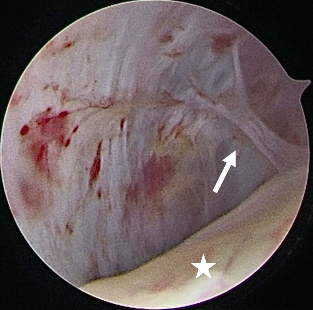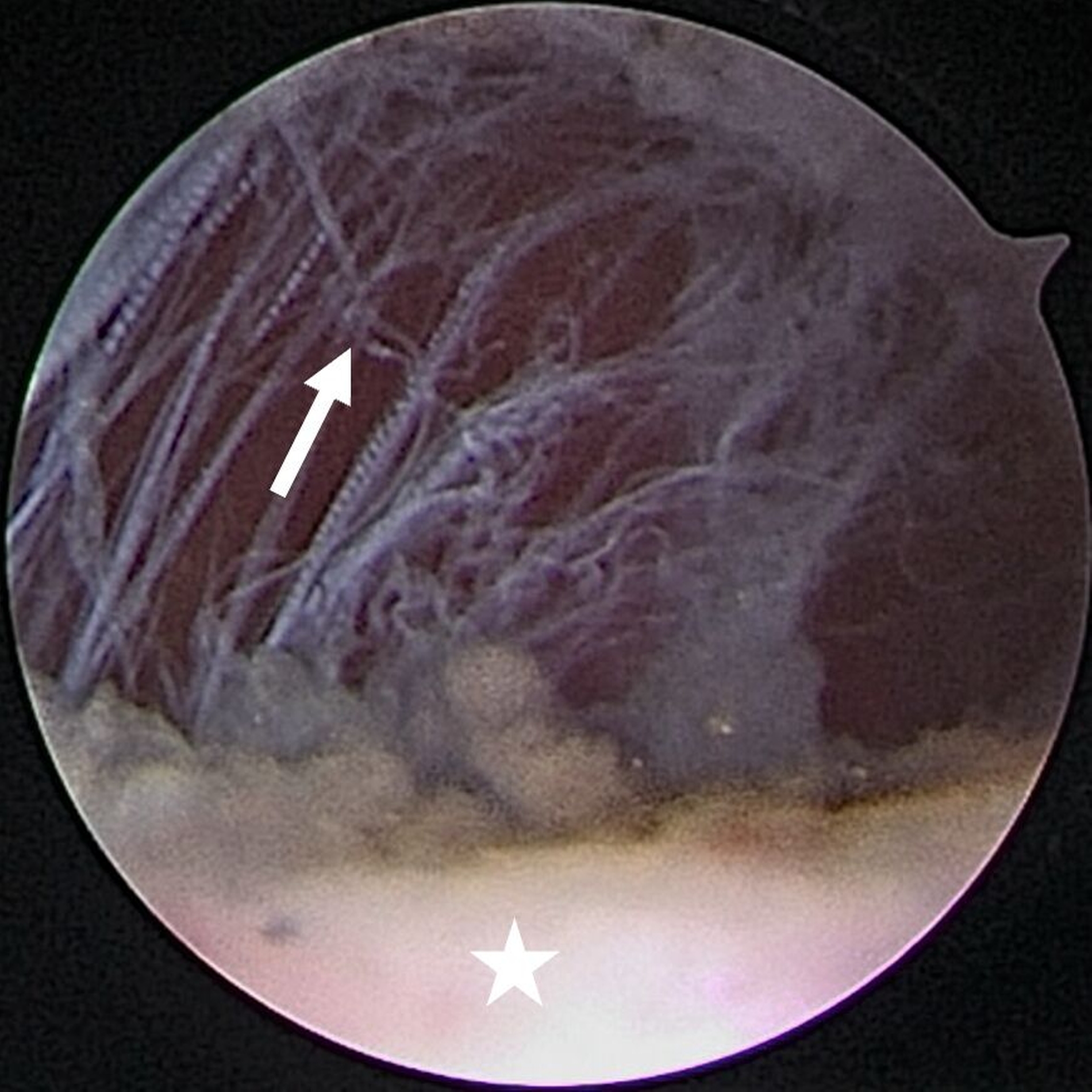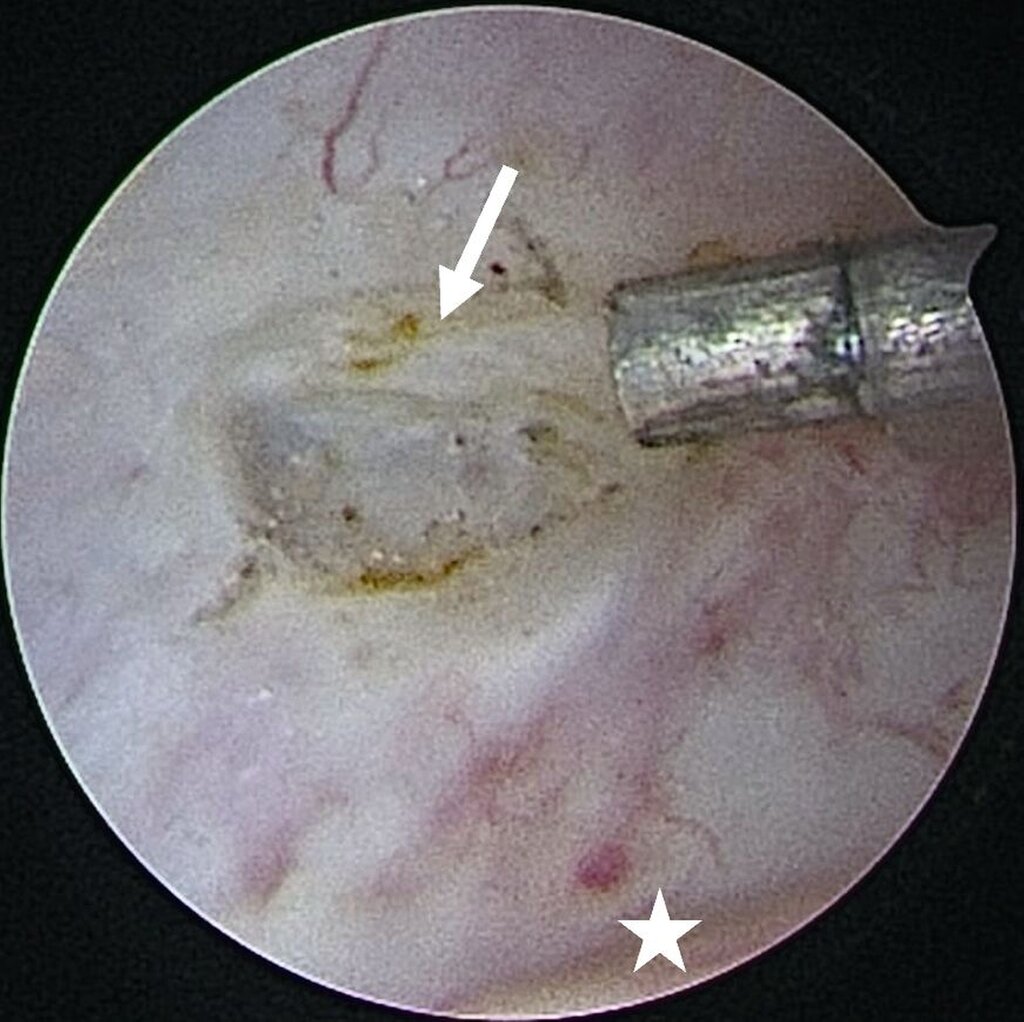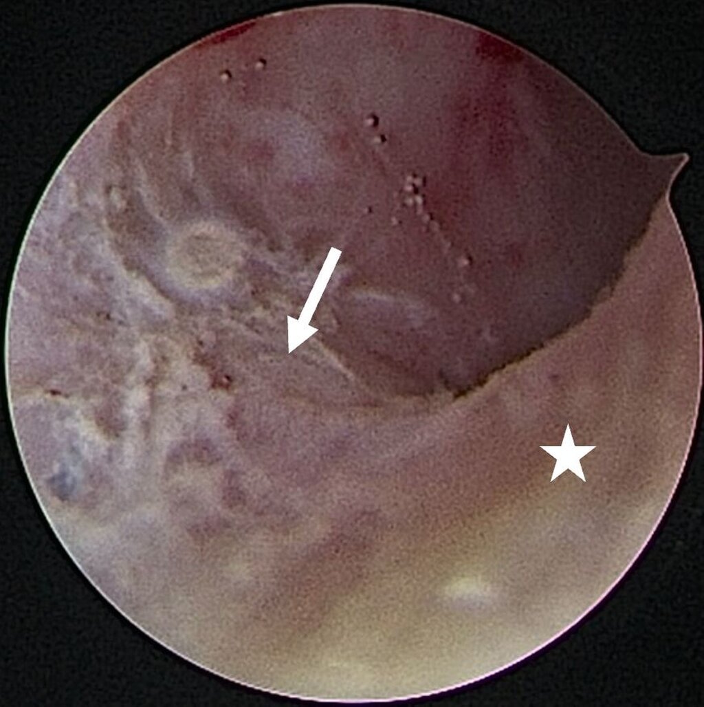Abb. 8a: Intraartikuläre Darstellung bei synovialer Chondromatose: Ausgangsbefund im Bereich des hinteren Aufhängungsbandes mit Sicht auf den distalen Anteil des Diskus (Stern) sowie den anterior gelegenen Anteil des freien Gelenkkörpers (Pfeil)
