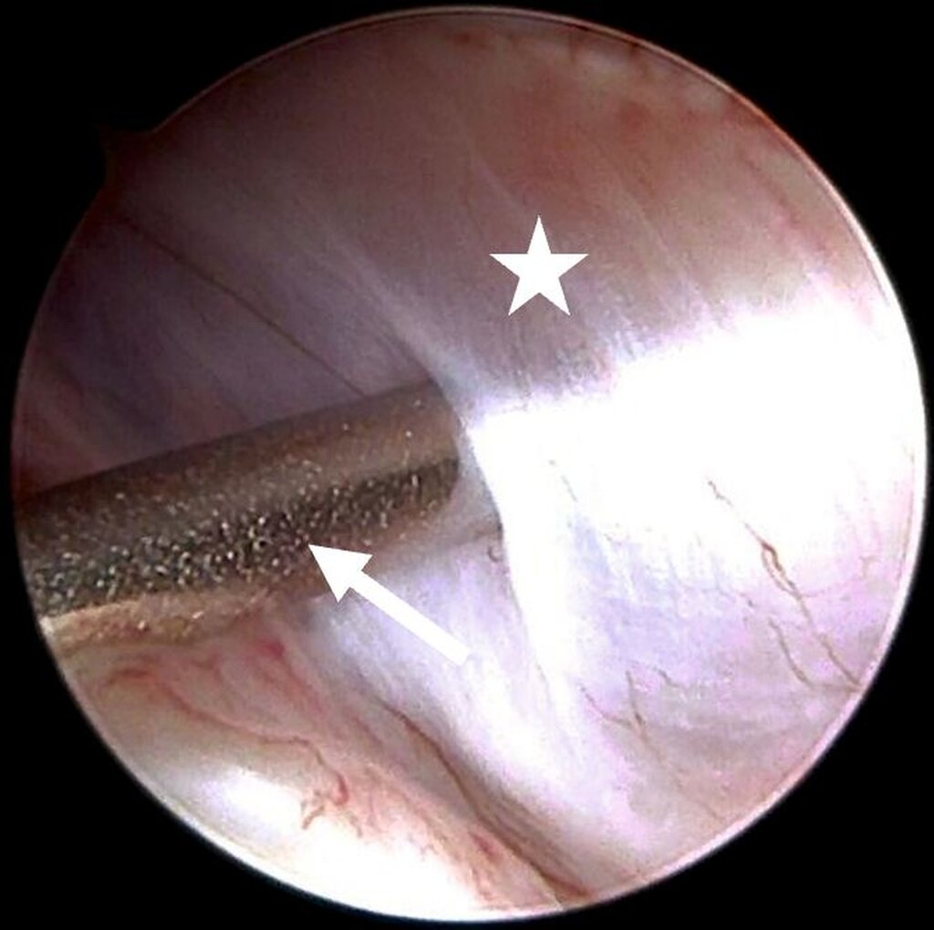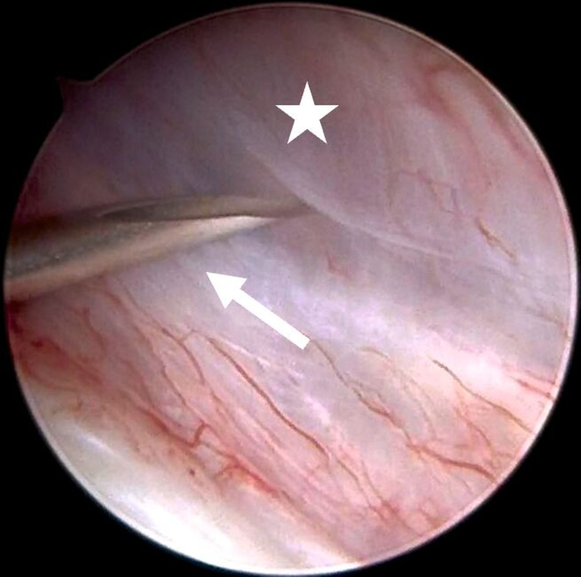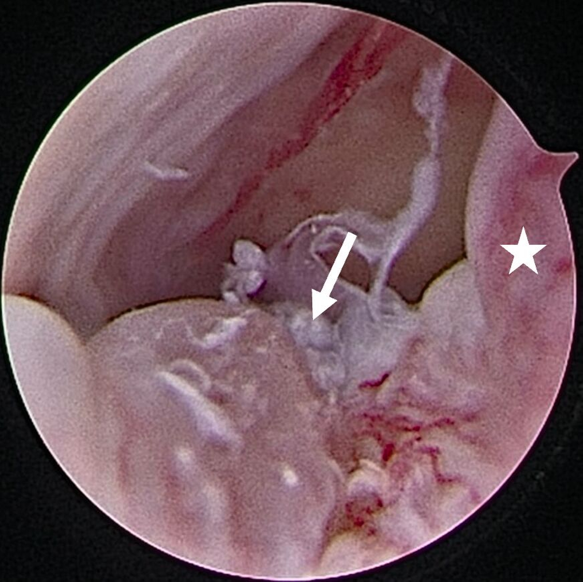Abb. 8a: Intraartikuläre Darstellung bei synovialer Chondromatose: Ausgangsbefund im Bereich des hinteren Aufhängungsbandes mit Sicht auf den distalen Anteil des Diskus (Stern) sowie den anterior gelegenen Anteil des freien Gelenkkörpers (Pfeil)