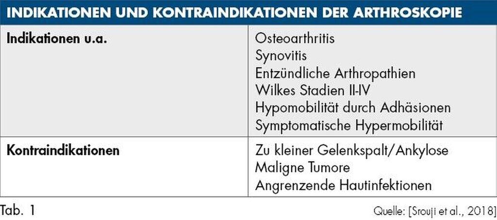 Grundsätzlich kann die Arthroskopie bei einem breiten Indikationsspektrum eingesetzt werden. Es sind nur wenige Kontraindikationen zu beachten (Tabelle 1).
