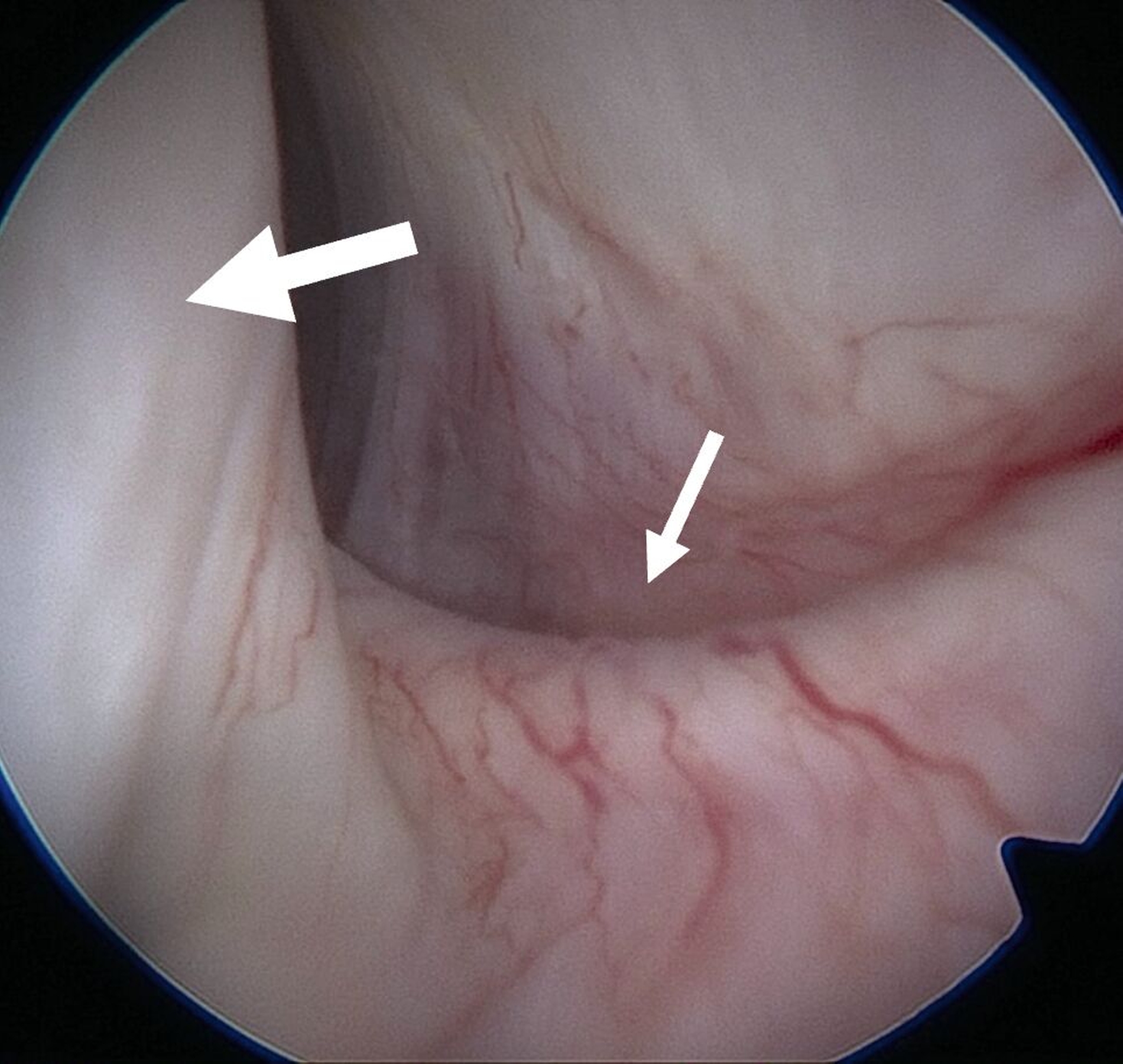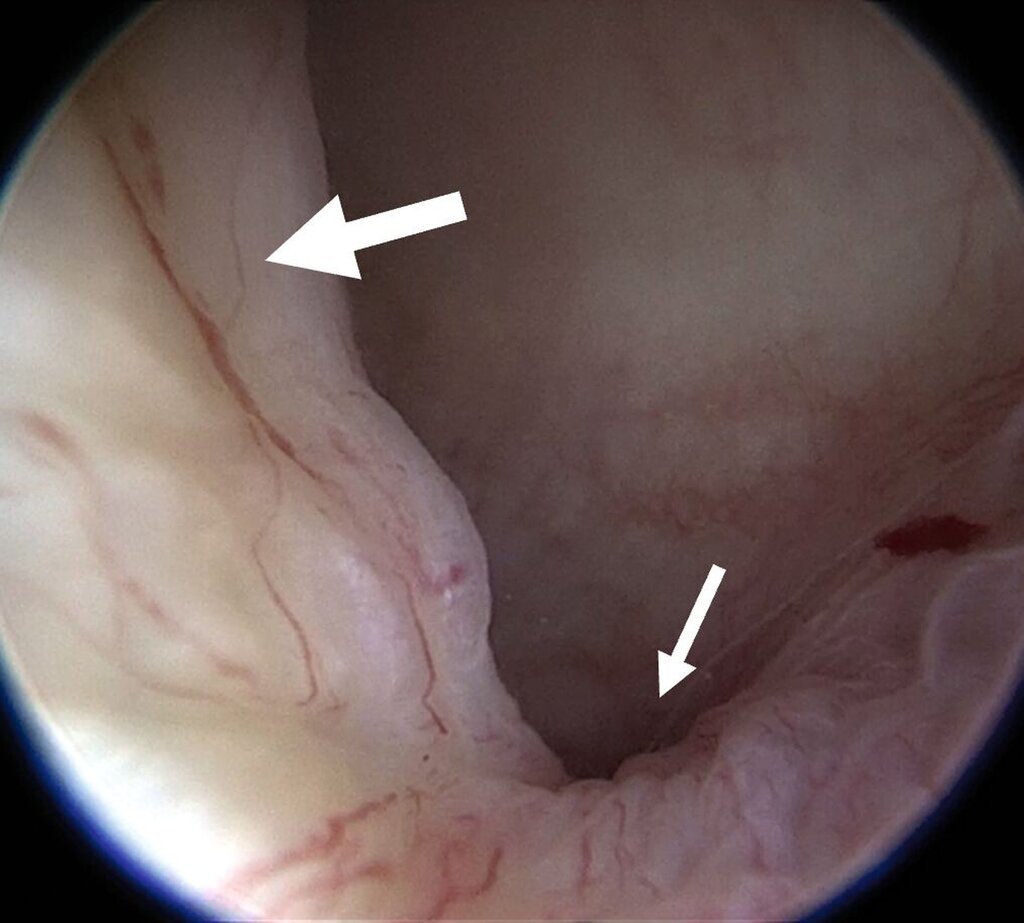 Eine Entzündung im Bereich der Gelenkkapsel (Synovitis) stellt eine häufige Ursache für arthrogen bedingte Beschwerden dar [Mercuri et al., 2025]. Neben der Darstellung des Gelenks und der Behandlung von Pathologien beruht ein positiver Effekt der Arthroskopie auf der Lavage des Gelenks. Dadurch können zum Beispiel proinflammatorische Mediatoren entfernt und intraartikuläre Adhäsionen gelöst werden [Soni, 2019]. Abbildung 2 zeigt die intraoperativen Befunde von zwei Patienten. Es wird jeweils der Übergang zwischen dem hinteren Aufhängungsband und der pars posterior des Discus articularis dargestellt.