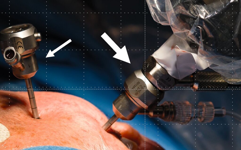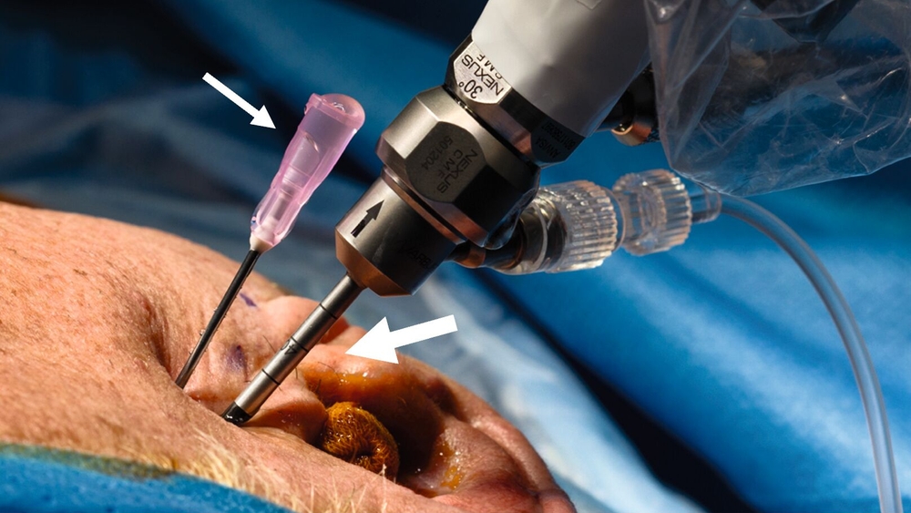 Man unterscheidet drei Formen der Arthroskopie (Level I–III) in Abhängigkeit von der Anzahl der verwendeten Arbeitskanäle. Bei der Level-I-Arthroskopie steht die erweiterte Diagnostik im Vordergrund. Dabei wird das Arthroskop mithilfe eines Trokars im Bereich des höchsten Punkts der Fossa mandibularis in den oberen Gelenkspalt eingebracht. Eine separate Spülkanüle ermöglicht die kontinuierliche Gelenkspülung (Abbildung 1). Die Operation findet in der Regel in ambulanter Vollnarkose statt. Eine Erweiterung auf Level II oder Level III, also die Einführung weiterer Arbeitskanäle, ist während der Operation möglich, sofern dies aufgrund des Befunds indiziert ist.