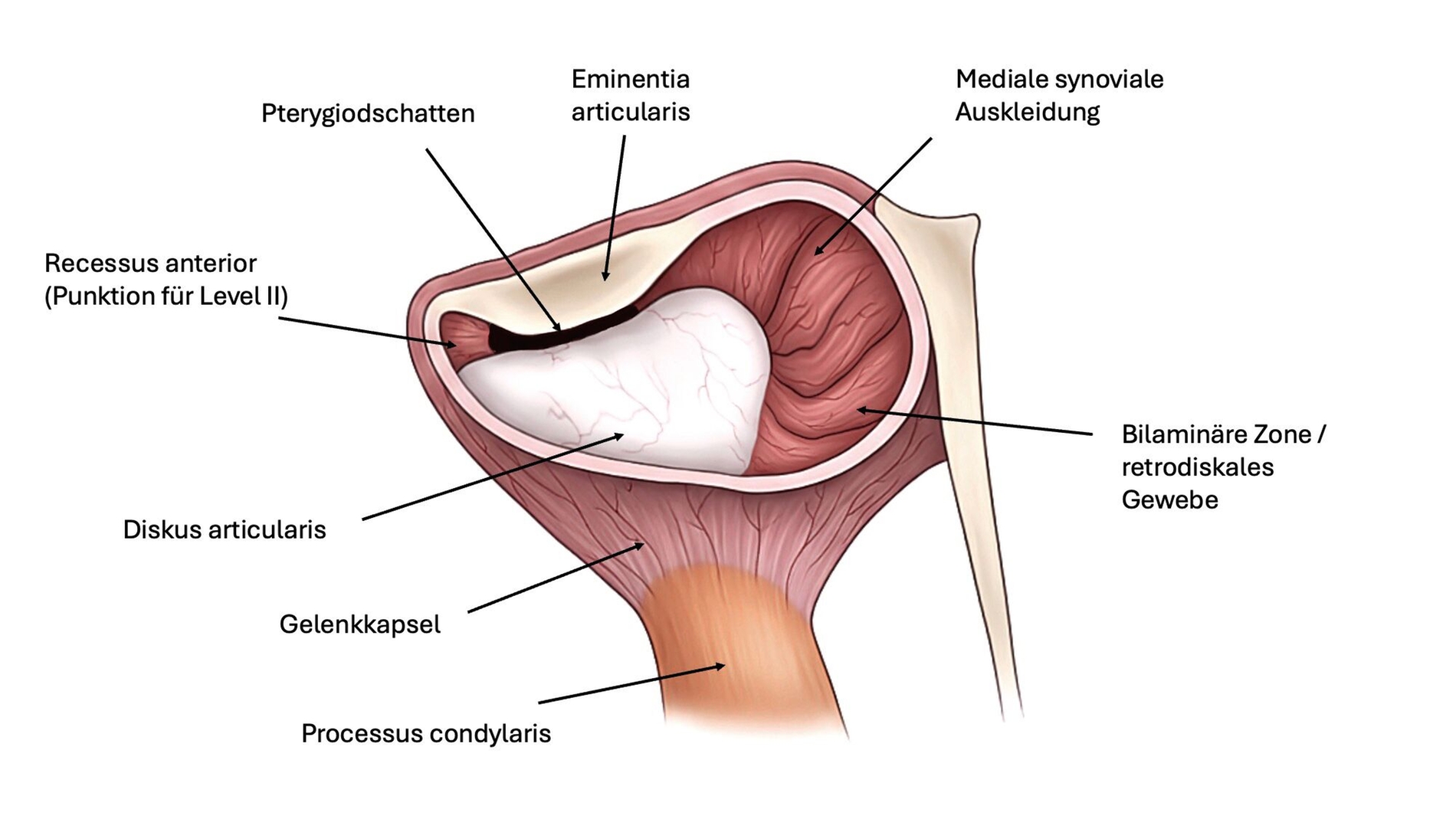 Für die Kiefergelenksarthroskopie ist eine strukturierte Orientierung innerhalb des oberen Gelenkkompartiments essenziell. Hierfür haben sich die sogenannten „seven points of interest“ nach McCain etabliert (Abbildung 3) [Srouji et al., 2018]. Diese sieben anatomischen Referenzpunkte dienen der systematischen Beurteilung des Gelenks während des arthroskopischen Eingriffs. Zunächst werden das mediale synoviale Band und der Pterygoid-Schatten („pterygoid-shadow“) als Orientierungspunkte identifiziert. Es folgen die bilaminäre Zone – eine häufige Schmerzquelle – sowie die hintere Schräge der Gelenkeminenz. Die Beurteilung des Discus articularis gibt Auskunft über Verlagerungen und degenerative Prozesse. Es folgt die Beurteilung der intermediären Zone, die besonders anfällig für eine Perforation ist. Abschließend erfolgt die Begutachtung des vorderen Recessus. Dieser stellt den Eintritt der Punktionsstelle des Level-II-Zugangs dar [Srouji et al., 2018].