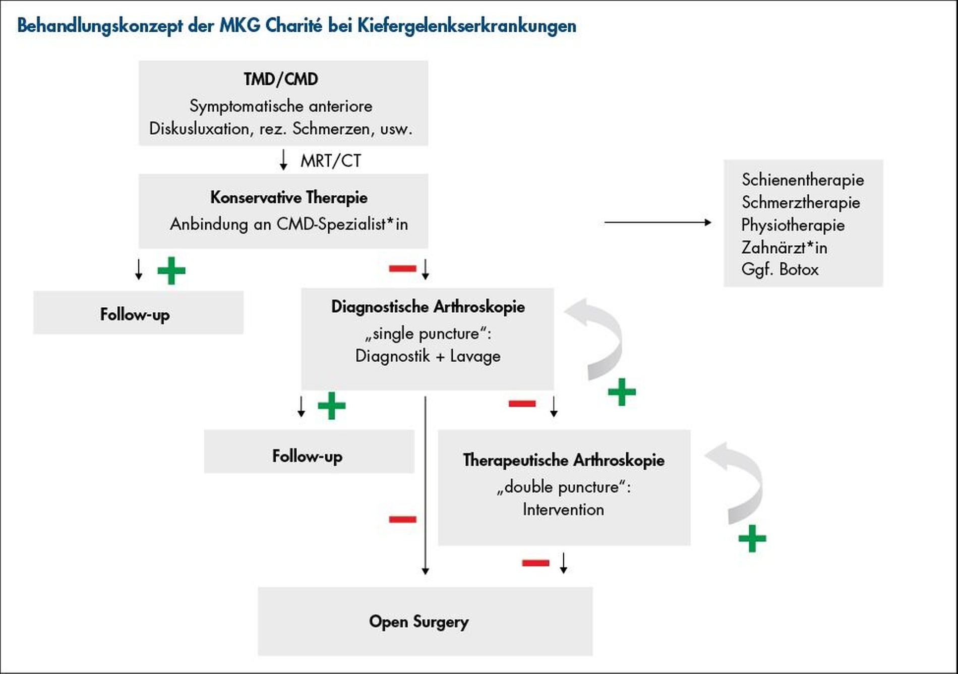 Sollte eine arthroskopische Behandlung nicht möglich oder erfolgversprechend erscheinen, ist in ausgewählten Fällen ein offenes chirurgisches Vorgehen indiziert [Baecher et al., 2025]. Bei myogener Genese kann darüber hinaus zusätzlich eine Botulinumtoxin-Injektion in die Kaumuskeln zur Reduktion von Schmerzen und Muskelhyperaktivität beitragen. Neue Therapieoptionen wie die transarterielle Embolisation (TAE) können bei therapieresistenten Beschwerden in Erwägung gezogen werden [Fleckenstein et al., 2025].