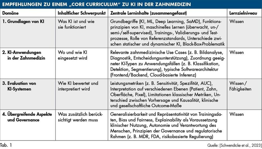 Die beschriebenen Entwicklungen legen nahe, dass KI in der zahnmedizinischen Ausbildung nicht allein projektbezogen oder fakultativ behandelt werden sollte. Vielmehr stellt sich die Frage, ob es einer übergreifenden strategischen Rahmung bedarf. Denkbar wären definierte Mindestkompetenzen im Umgang mit KI im Studium, eine curriculare Verankerung entsprechender Inhalte sowie abgestimmte Fortbildungskonzepte in der Weiterbildung. Die WHO/ITU-Initative „KI im Gesundheitswesen“ hat Vorschläge für ein zahnmedizinisches „Mindestcurriculum“ gemacht [Schwendicke et al., 2023] (Tabelle 1).