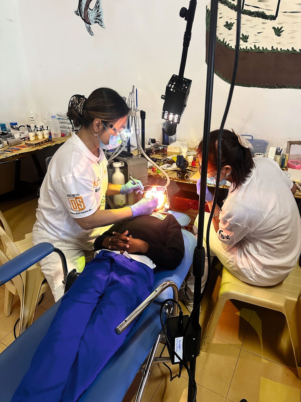 Das Hauptziel der Behandlungen ist der Erhalt der bleibenden Zähne. Milchzähne werden nur in Ausnahmefällen behandelt. Das Team arbeitet konzentriert, trotz der hohen Patientenzahl wird auf eine kindgerechte Betreuung geachtet. Wir hatten eine erfahrene Zahnarzthelferin an unserer Seite, die uns vor Ort mit Rat und Tat unterstützte.