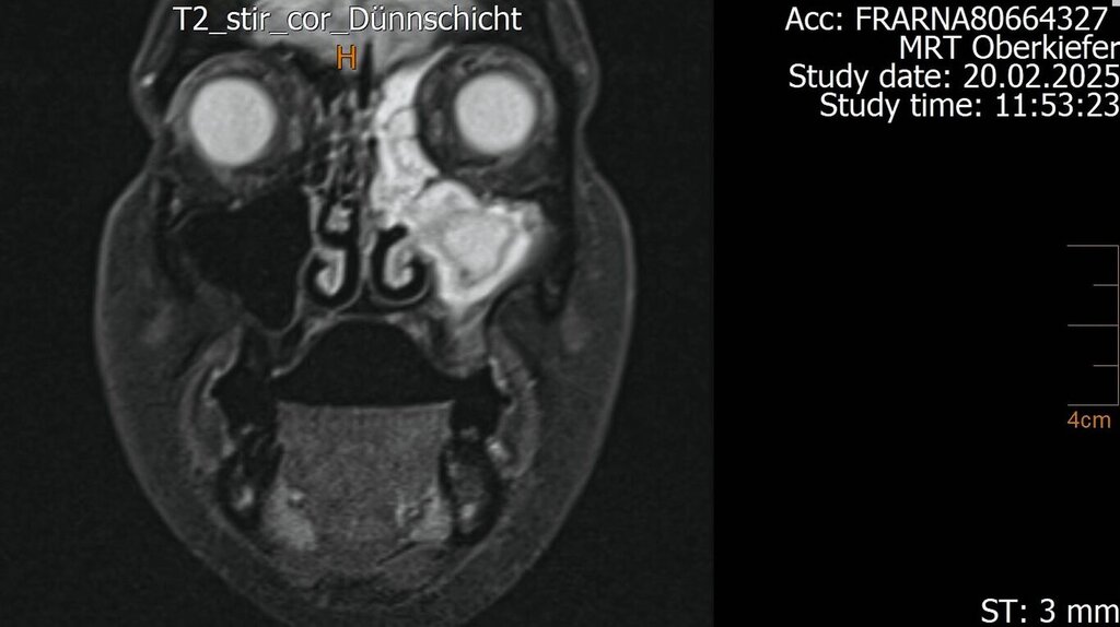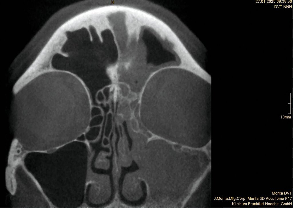In der Folge wurde leider die weiterhin bestehende Symptomatik als rhinogen fehlinterpretiert, da die odontogenen Foki als behandelt galten. Ab August 2023 entwickelte die Patientin eine einseitige, linksbetonte Pansinusitis mit persistierender Sekretion, Kopfschmerzen und zunehmender Abgeschlagenheit. Wiederholte HNO-ärztliche Behandlungen mit Clindamycin und Kortison führten zu einer nur vorübergehenden Besserung. Die weiterhin bestehende odontogene Ursache blieb unerkannt.