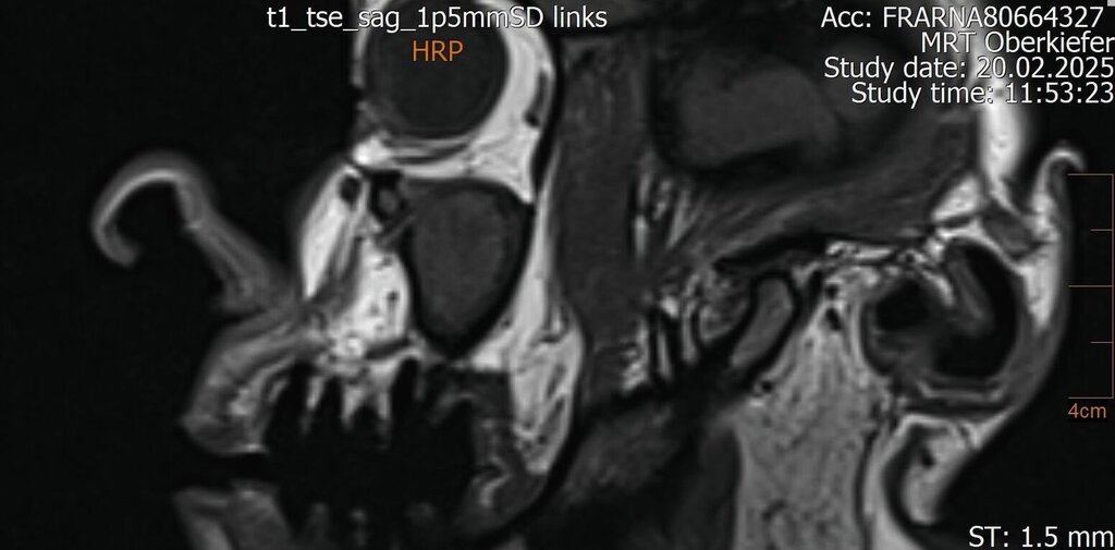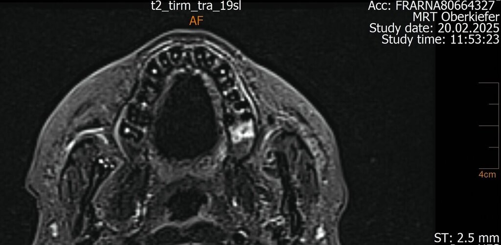 In speziellen Fällen kann ergänzend eine MRT sinnvoll sein – etwa bei unklarer Symptomatik, bei Verdacht auf Weichteilbeteiligung, bei einem chronisch-rezidivierenden Verlauf oder bei unzureichender Abgrenzbarkeit im DVT. Im vorgestellten Fall ermöglichte die MRT den Nachweis des interradikulären Fistelgangs zur Kieferhöhle und damit die korrekte Zuordnung des Entzündungsfokus.
