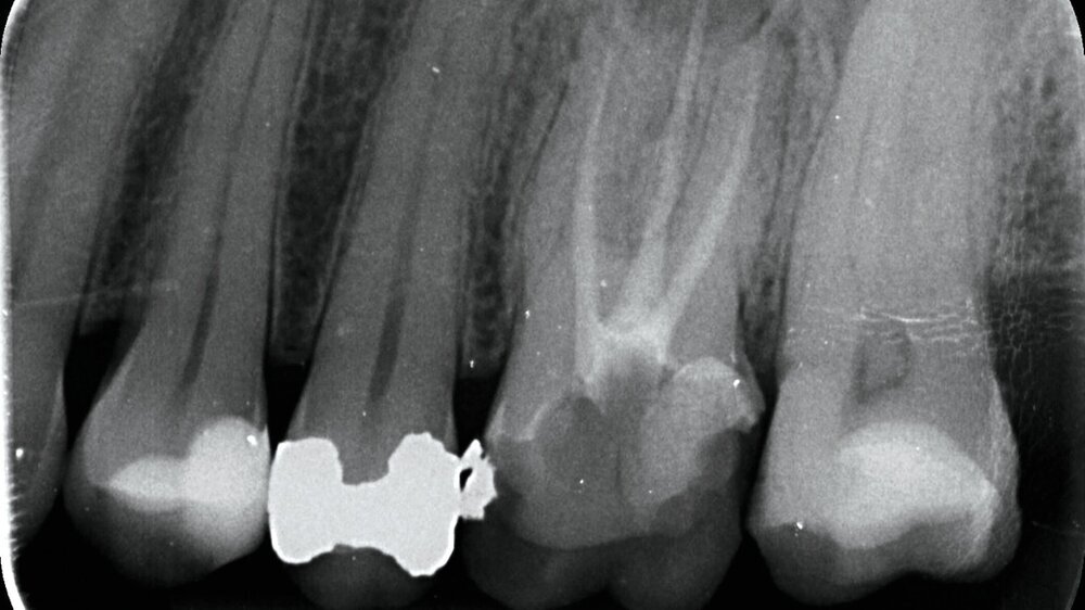 Im Februar 2022 stellte sich die 46-jährige Patientin nach Überweisung durch die Hauszahnärztin mit seit zwei Wochen bestehenden Schmerzen im linken Oberkiefer in einer MKG-chirurgischen Praxis vor. Klinisch und radiologisch zeigten sich eine tiefe Karies an Zahn 26 mit apikaler Ostitis und enger Beziehung zur Kieferhöhle (Abbildung 1) sowie der devitale Zahn 27.