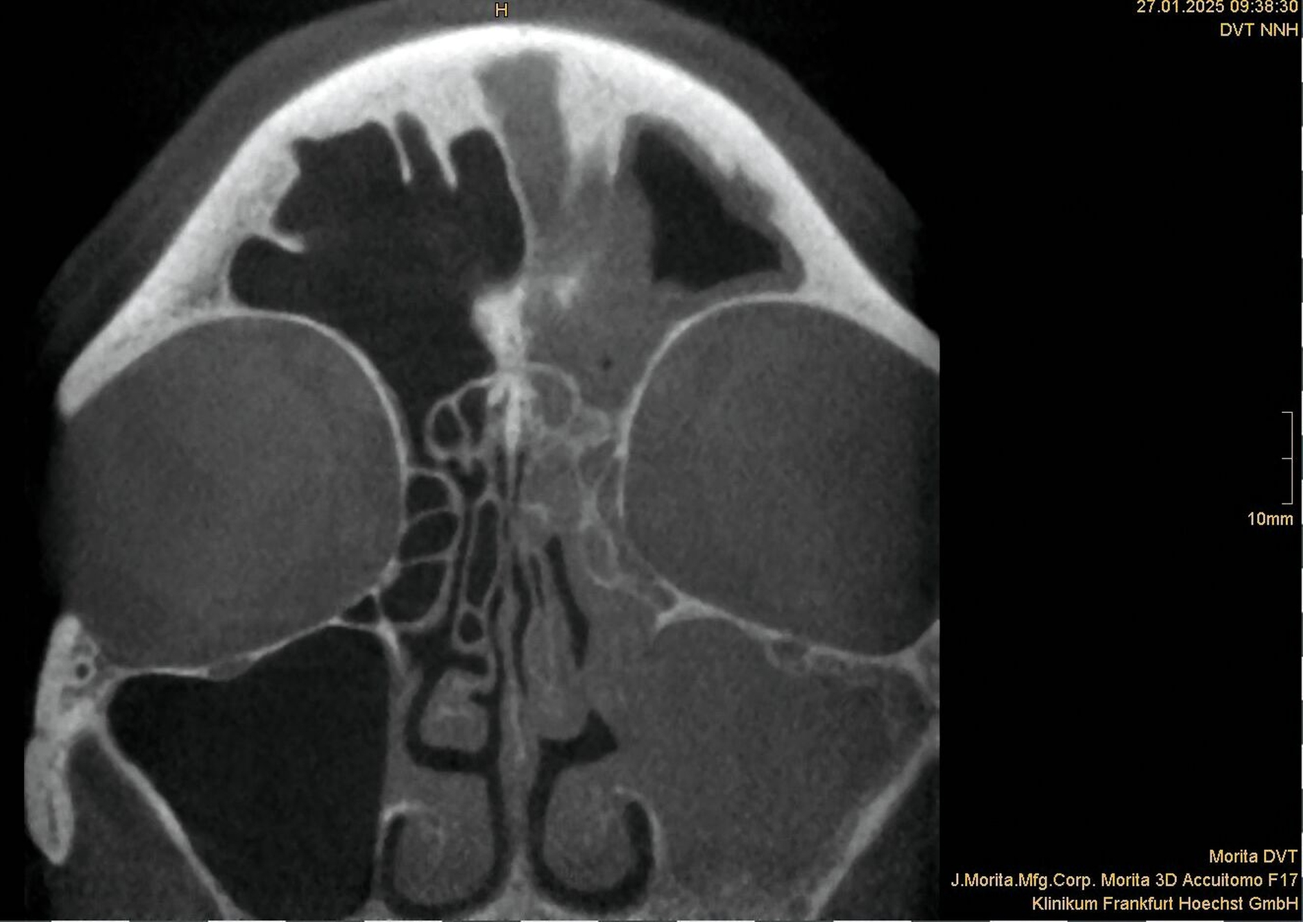 Ein im Februar 2024 durch die HNO veranlasstes DVT bestätigte erneut eine einseitige Pansinusitis (Abbildung 3), ohne den dentalen Bezug zu erfassen. Daraufhin wurde eine chirurgische Sanierung der Nasennebenhöhlen geplant, die jedoch aus Kapazitätsgründen des Krankenhauses nicht durchgeführt wurde. Im Januar 2025 kam es schließlich zu einer akuten Verschlechterung mit starken Schmerzen.
