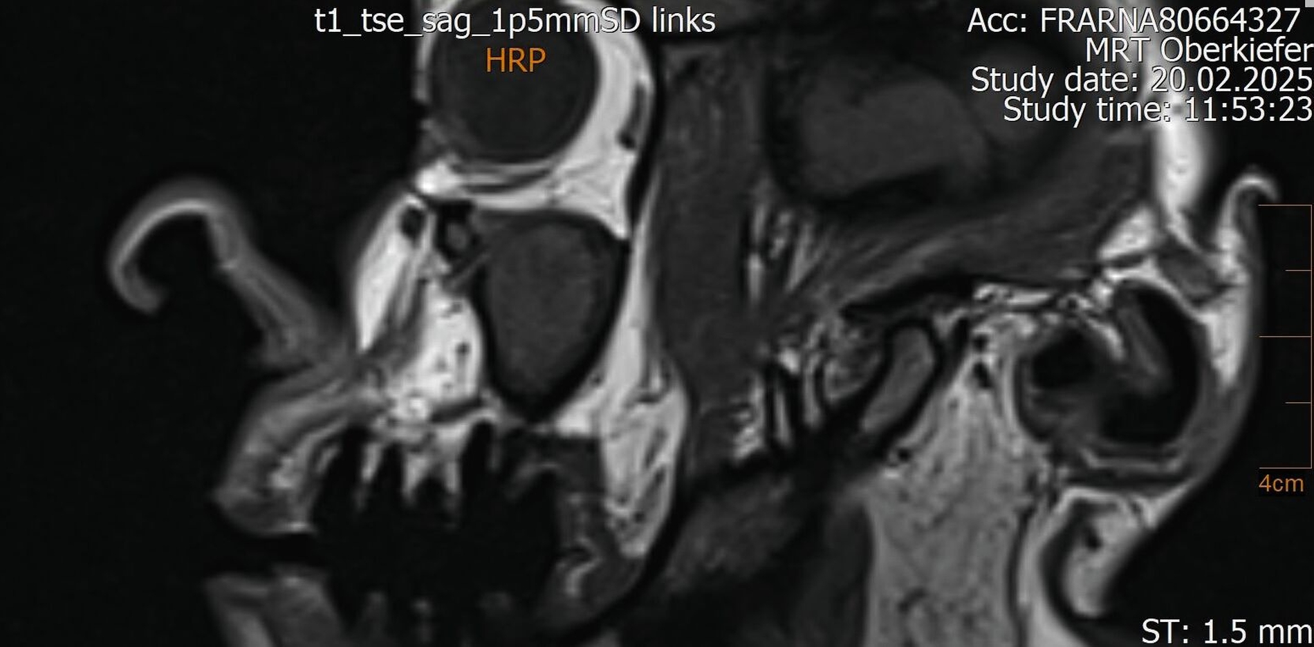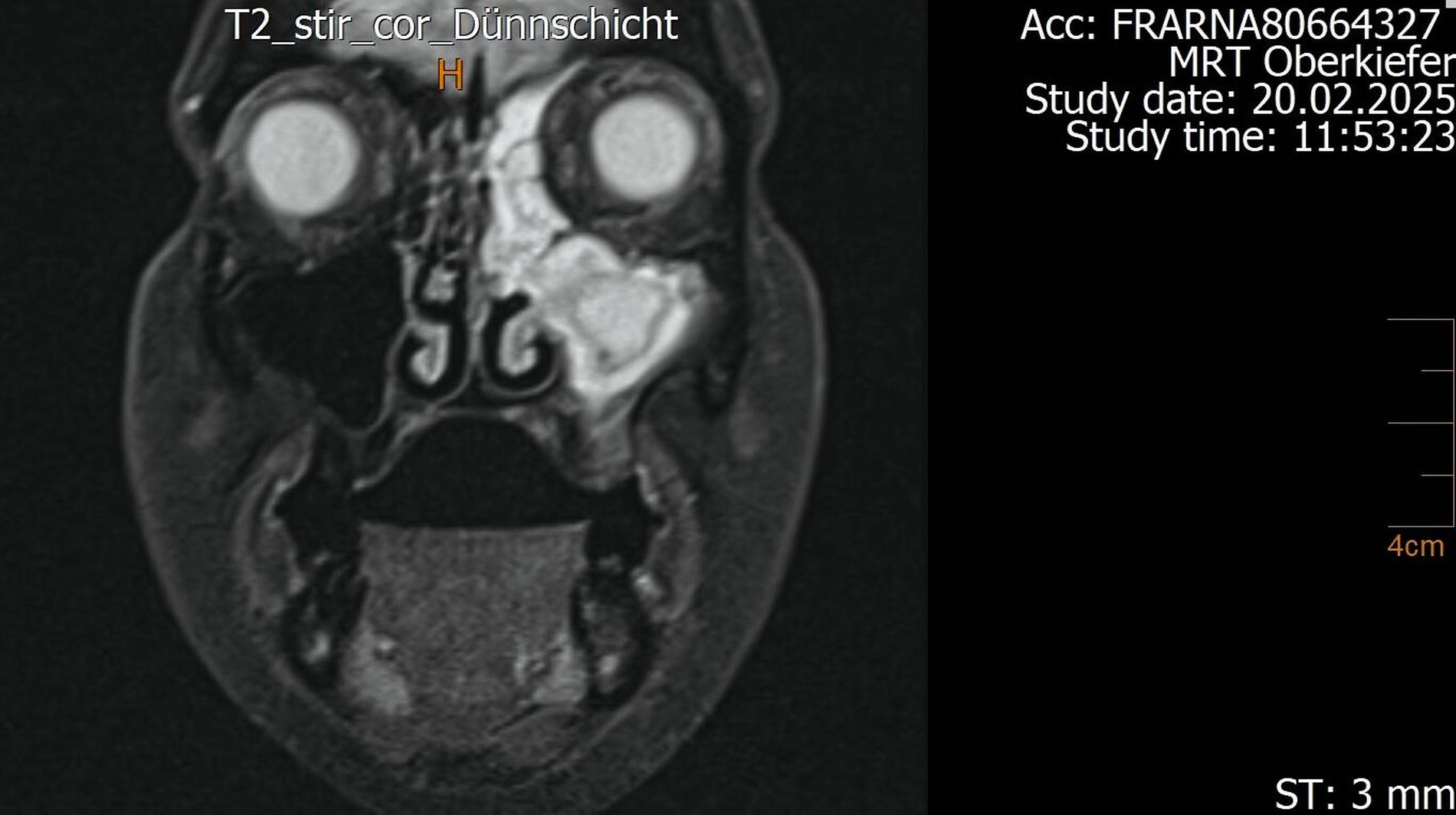 Der Wendepunkt erfolgte schließlich im Februar 2025 im Rahmen einer Kontrolluntersuchung bei der Hauszahnärztin. Diese nahm die langjährige Beschwerdesymptomatik ernst und veranlasste eine MRT-Untersuchung am Deutschen Zentrum für Dentaldiagnostik (DZD). Die MRT-Bildgebung ergab eine chronische Osteomyelitis im Bereich der Extraktionsregion von Zahn 27 sowie eine ausgeprägte apikale Ostitis an Zahn 26 mit vollständiger Verschattung der linken Kieferhöhle und Ausdehnung der Entzündung ins Siebbein und in die Stirnhöhle. Auch konnte durch den befundenden Radiologen eine interradikuläre Fistelung an Zahn 26 erkannt werden, weshalb die Sinusitis als odontogen eingestuft wurde (Abbildungen 4 bis 7).