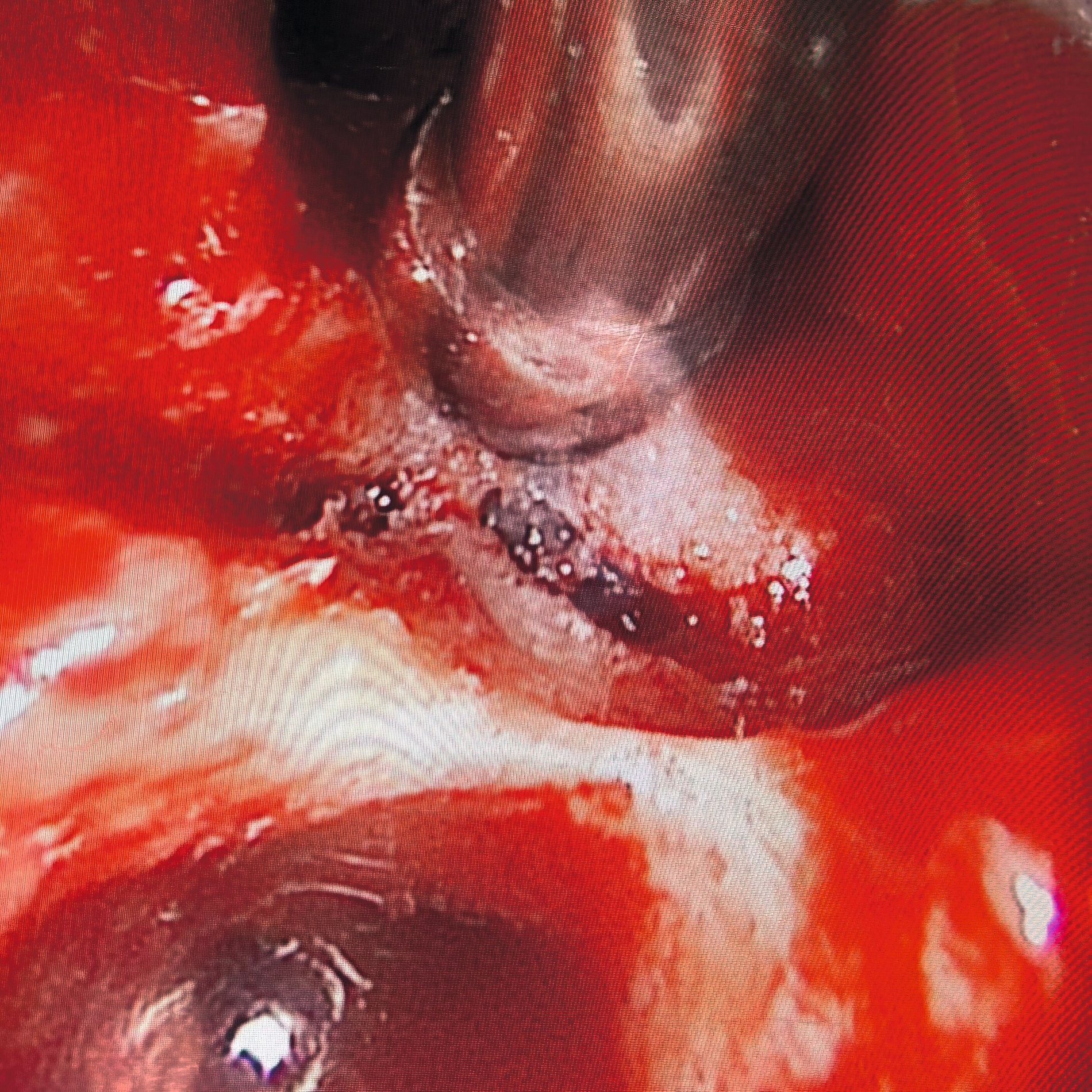 Intraoperativ zeigte sich die interradikuläre Perforation im Sinne eines Fistelgangs zur linken Kieferhöhle (Abb. 8), die bereits präoperativ in der alio loco durchgeführten MRT-Bildgebung erkennbar gewesen war (Abb. 7). Zudem entfernten wir das Empyem und die pathologisch veränderte Schleimhaut sowie das Narbengewebe unter Schonung der noch intakten Schneider’schen Membran.