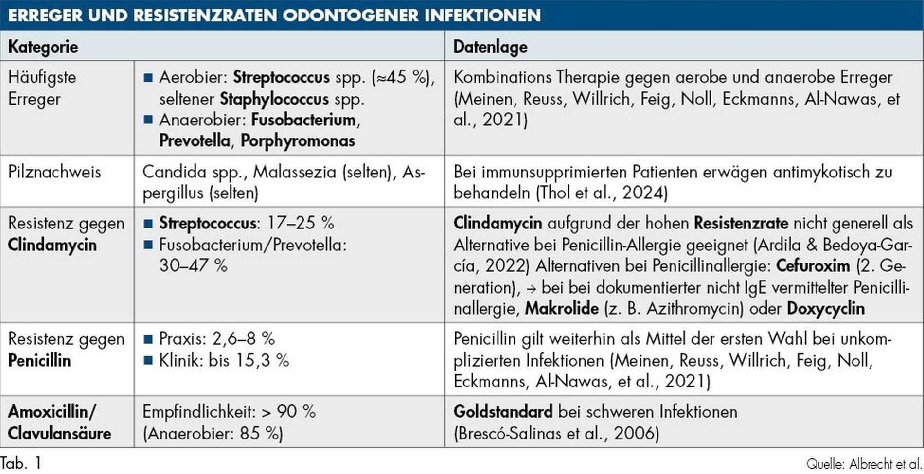 Aktuelle Studien zeigen hohe Resistenzraten gegenüber den häufig verwendeten Antibiotika: Clindamycin: 17–47 Prozent Resistenz bei Streptococcus, Fusobacterium, Prevotella; Metronidazol: 25,5 Prozent Resistenz bei Anaerobiern; Penicillin: 2,6–15,3 Prozent Resistenz bei Streptococcus, Staphylococcus [Ardila & Bedoya-García, 2022; Bigus et al., 2023; Heim et al., 2020; López-González et al., 2019; Meinen et al., 2021; Țenț et al., 2019; Thol et al., 2024; Vavro et al., 2024].