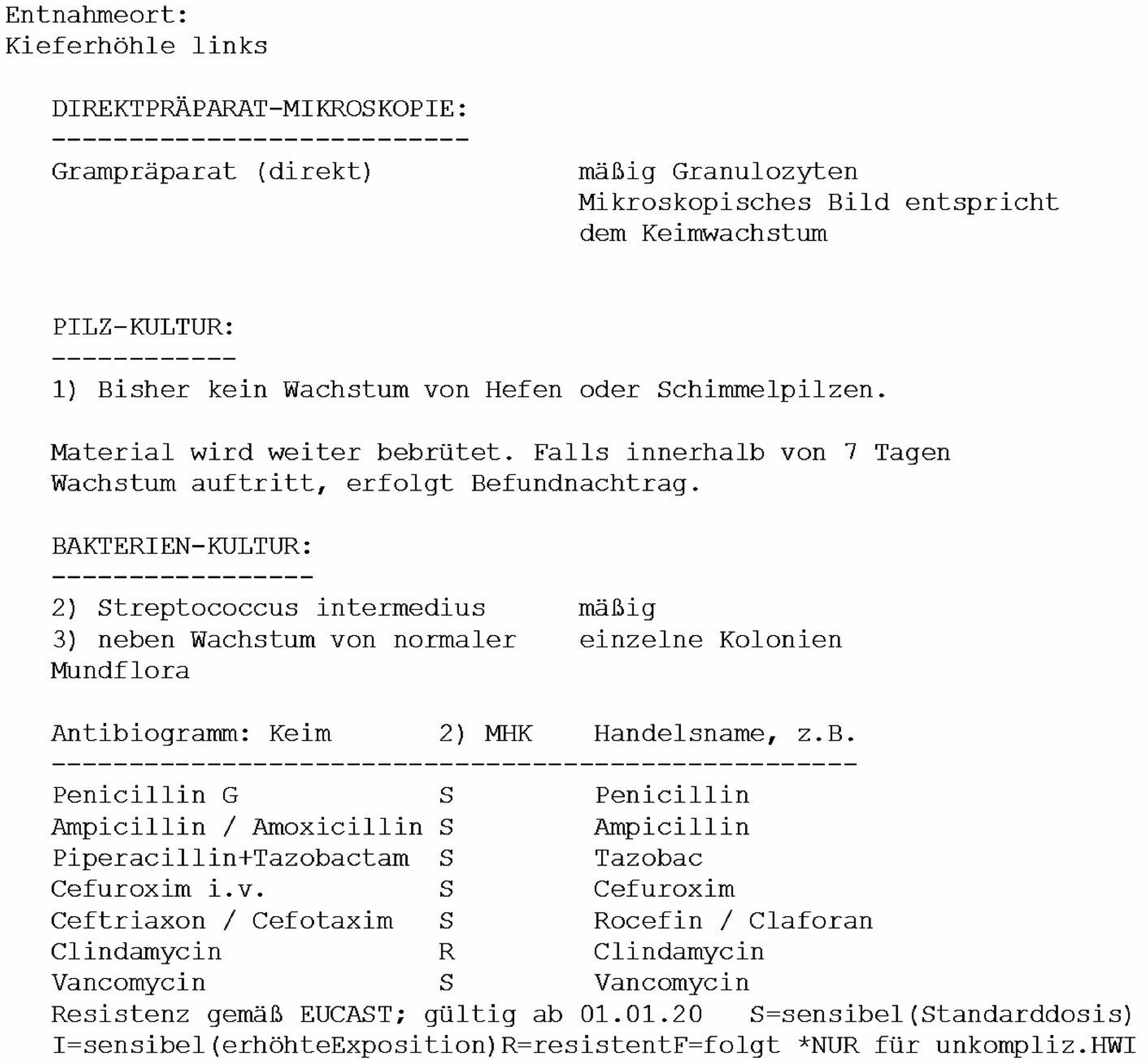 Etwa eine Woche postoperativ entwickelte sich eine eitrige Sekretion im Bereich der Naht auf dem Alveolarkamm regio 26. Die mikrobiologische Untersuchung (siehe Antibiogramm, Abbildung 9) zeigte beim dominierenden Streptococcus intermedius eine Resistenz gegenüber Clindamycin. Da die Patientin eine Penicillinallergie angab, wurde nach eingehender Abwägung eine zehntägige Therapie mit Cefuroxim (Cefurax 500 mg) eingeleitet, die zu einer klinischen Ausheilung und Beschwerdefreiheit führte.