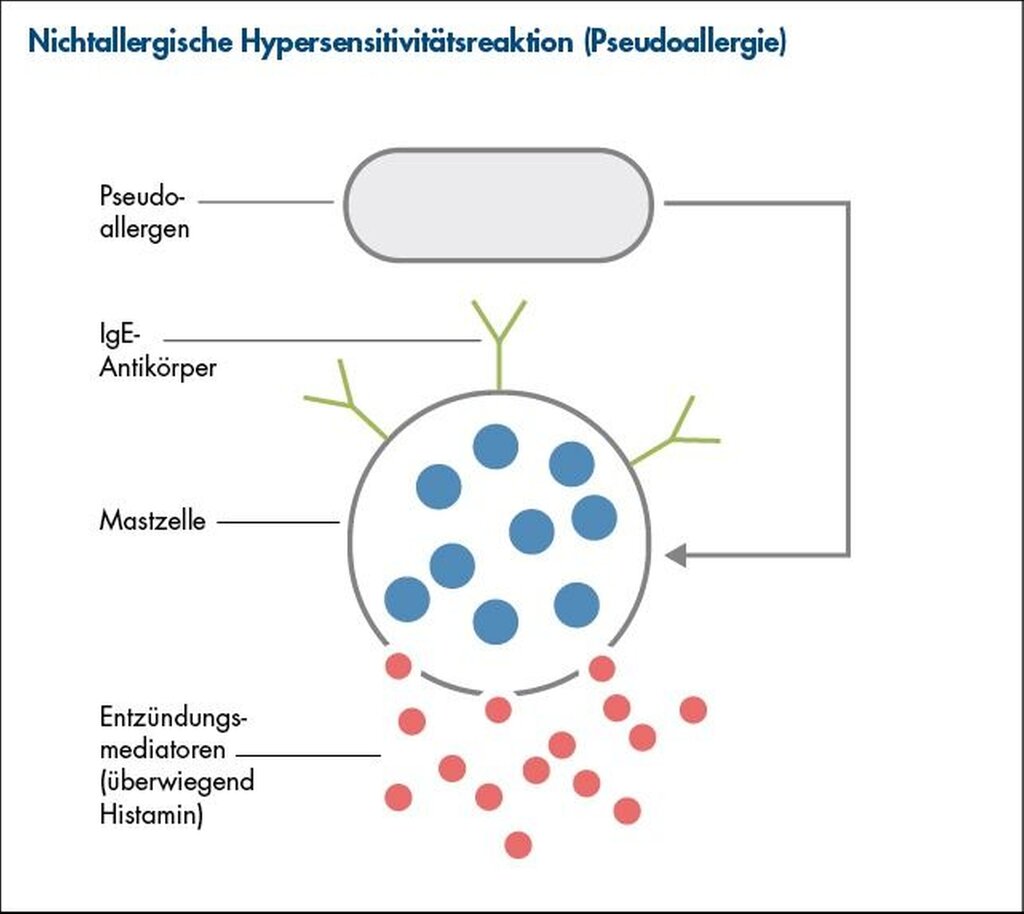 Die Mastzell-Aktivierung mit Ausschüttung von Histamin und anderen Entzündungsmediatoren erfolgt direkt und unspezifisch ohne vorherige Sensibilisierung und ohne Beteiligung oberflächlich gebundener Antikörper (Abbildung 2). Demzufolge sind diagnostische Haut- oder Bluttests üblicherweise negativ. Klinisch äußern sich die Pseudoallergien ähnlich wie Typ-I-Reaktionen mit Hautausschlag, Rhinitis, Dyspnoe und Krämpfen [Simon, 1996].