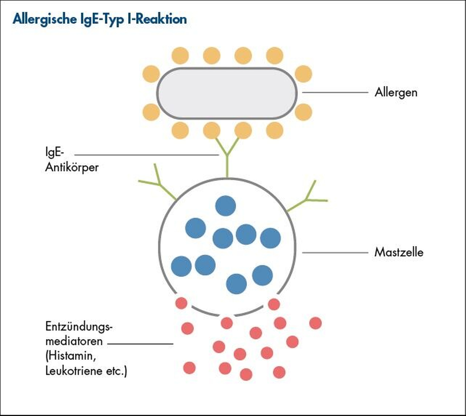 Die Typ-I-Reaktion wird über Immunglobulin E (IgE)-Antikörper vermittelt, die bei Allergenexposition Mastzellen und basophile Granulozyten zur Sekretion von Entzündungsmediatoren (zum Beispiel Histamin, Prostaglandine et cetera) anregen (Abbildung 1). Dies geschieht meist innerhalb weniger Minuten. Die Ausprägungsformen dieser Erkrankung sind urtikarielle Exantheme, Angioödeme, allergisches Asthma bronchiale, allergische Rhinokonjunktivitis und Anaphylaxie. Voraussetzung für eine Typ-I-Allergie ist ein vorher erfolgter Erstkontakt mit dem Allergen, der in der Regel symptomlos verläuft und als Sensibilisierung bezeichnet wird.