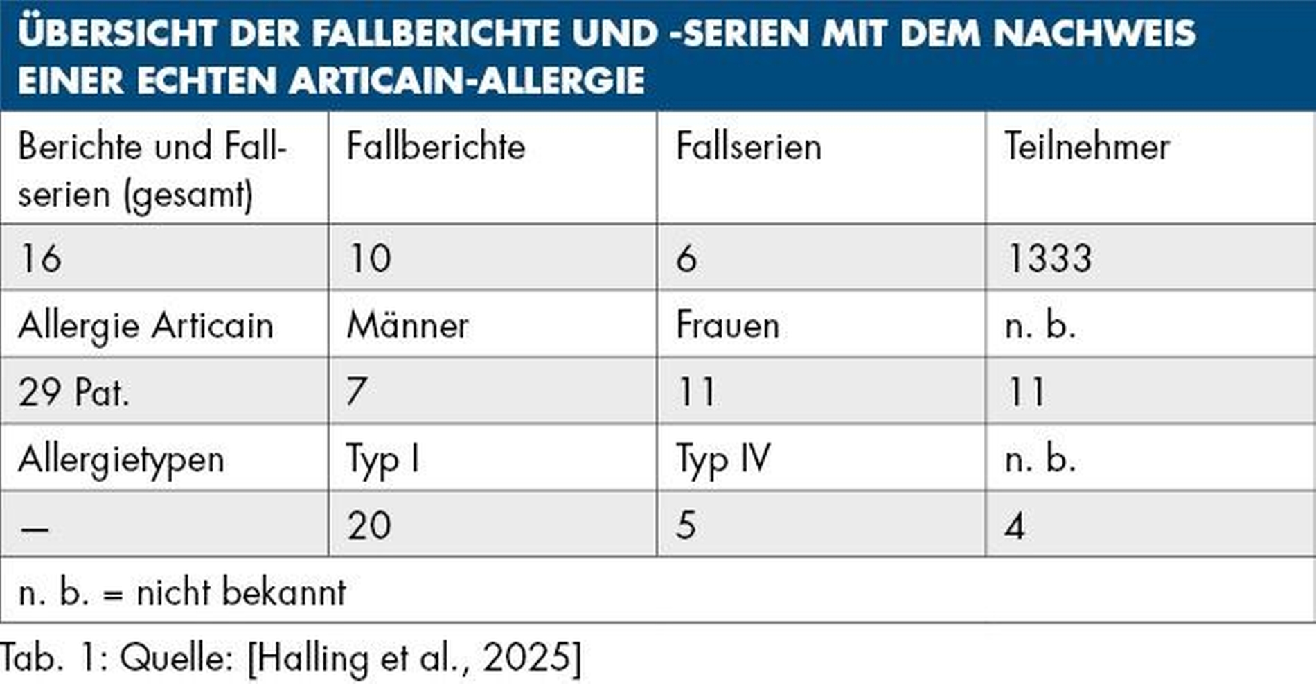 Obwohl lange bekannt ist, dass Articain nur sehr selten eine allergische Reaktion auslöst [Gall et al., 1996], fehlten bislang Daten, die die Häufigkeit einer solchen Allergie belegen. In einem aktuellen Review wurden in den vergangenen 25 Jahren 16 Fallberichte und -serien mit insgesamt 1.333 Teilnehmern gefunden, in denen Articain-Allergien erwähnt wurden [Halling et al., 2025]. Nur bei 29 Patienten konnte mittels klassischer allergologischer Diagnostik (Hauttestungen und/oder Provokationstest) tatsächlich eine echte Articain-Allergie nachgewiesen werden (Tabelle 1). Die Mehrzahl der betroffenen Patienten zeigte eine Typ-I-Allergie im Sinne einer Sofortreaktion. Nur in drei Fällen konnte eine Kreuzreaktivität mit anderen Lokalanästhetika vom Amid-Typ nachgewiesen werden.